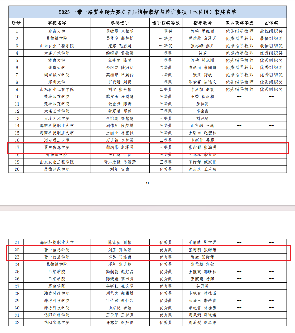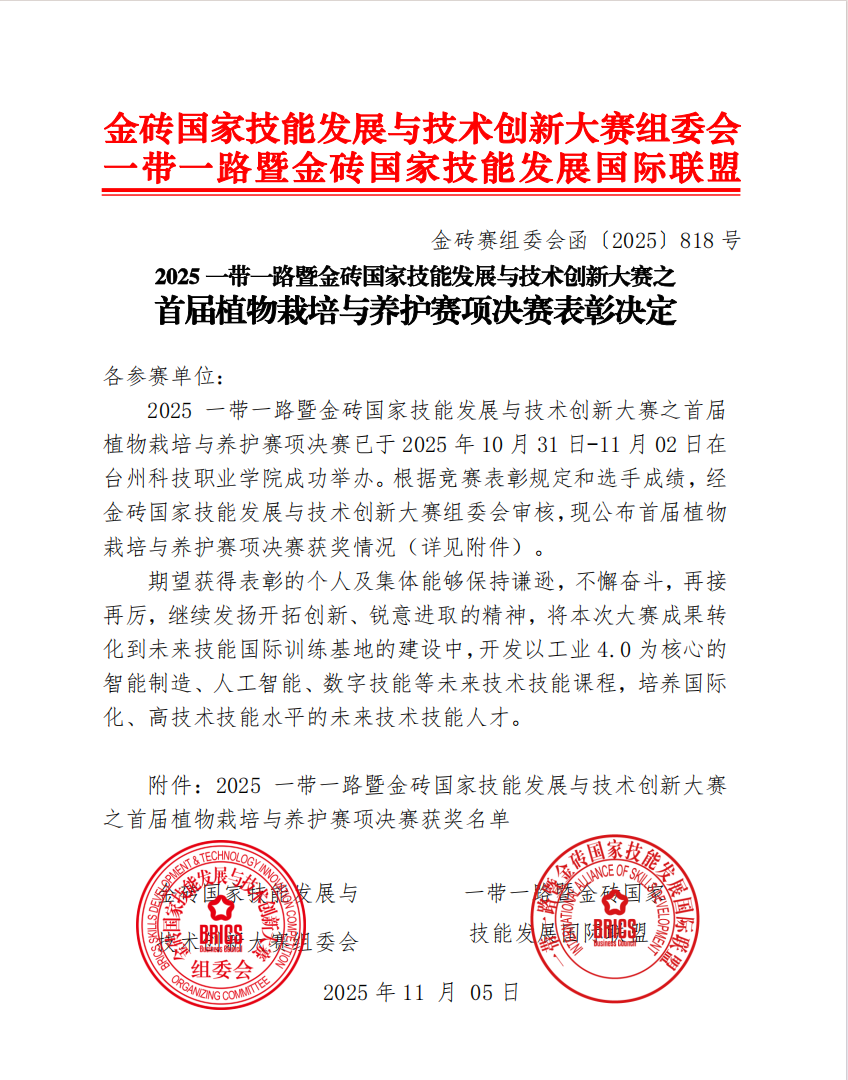 11月2日,2025“一带一路”暨金砖国家技能发展与技术创新大赛首届植物栽培与养护赛项在台州科技职业学院圆满落幕。来自全国109所高校的309支队伍、541名师生同台竞技,我校大健康学院学子在张甜甜、张海明、贾崴三位老师的精心指导下,凭借扎实的专业功底和出色的实践能力脱颖而出,最终斩获三等奖1项、优秀奖2项,所有参赛选手均获颁C级技能护照证书,充分展现了学院在植物栽培与养护领域的人才培养成效。