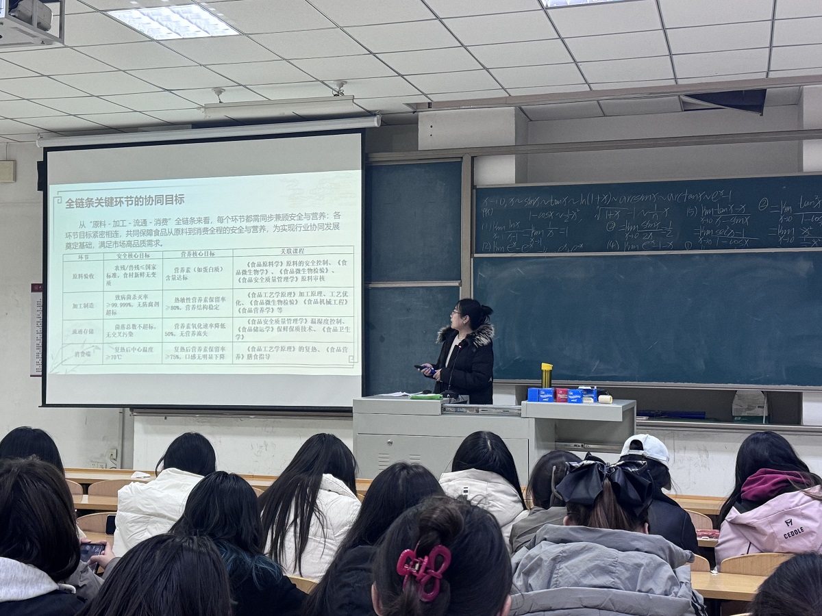 张芳老师从“协同逻辑构建”切入,拆解了食品营养与公共健康领域的底层逻辑:一方面厘清“营养成分-人体代谢-健康效应”的链式关系,用“宏量营养素平衡影响慢性病风险”“肠道菌群与营养吸收相互作用”等研究数据,让同学们理解不同要素间的联动机制;另一方面结合专业特性,点明食品质量安全管控与营养健康研究的协同关系——只有保障食品“安全底线”,才能进一步实现“营养高线”,为后续内容铺垫了清晰的思维框架。
