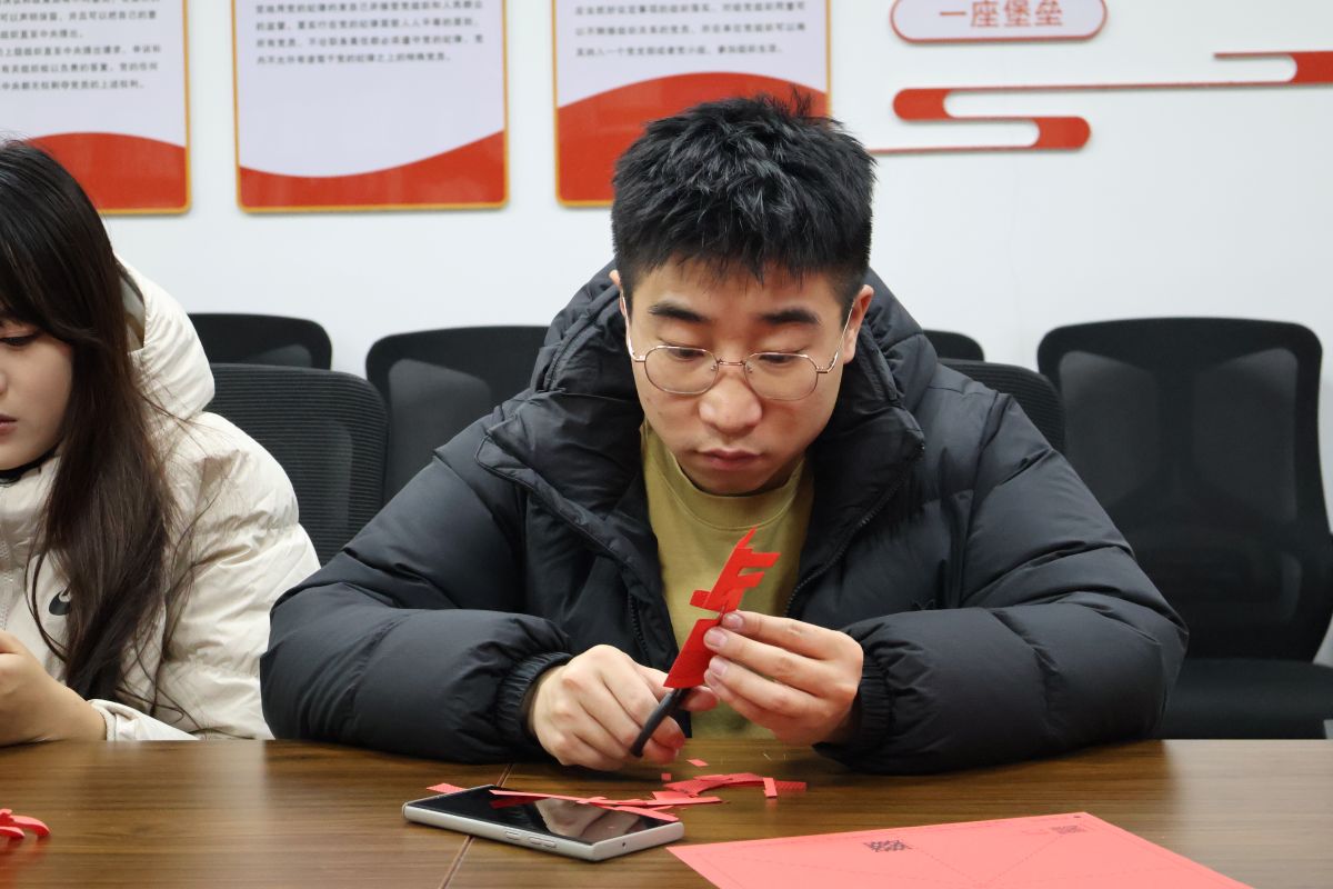 活动在轻松雅致的氛围中徐徐展开。老师们手持红纸与剪刀,或凝神勾勒,或巧手裁剪,一幅幅承载祝福的“福”字在指尖渐渐成型。现场特别设置了“五福”主题印章环节,分别对应“敬业福”“团结福”“创新福”“暖心福”与“阿信福”,象征教学耕耘、团队协作、开拓创新、同事情谊与校园特色。活动中,大家交流技法、分享心得,欢声笑语不绝于耳,场面温馨而热烈。