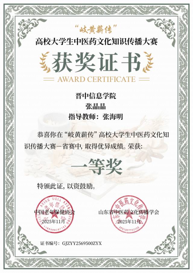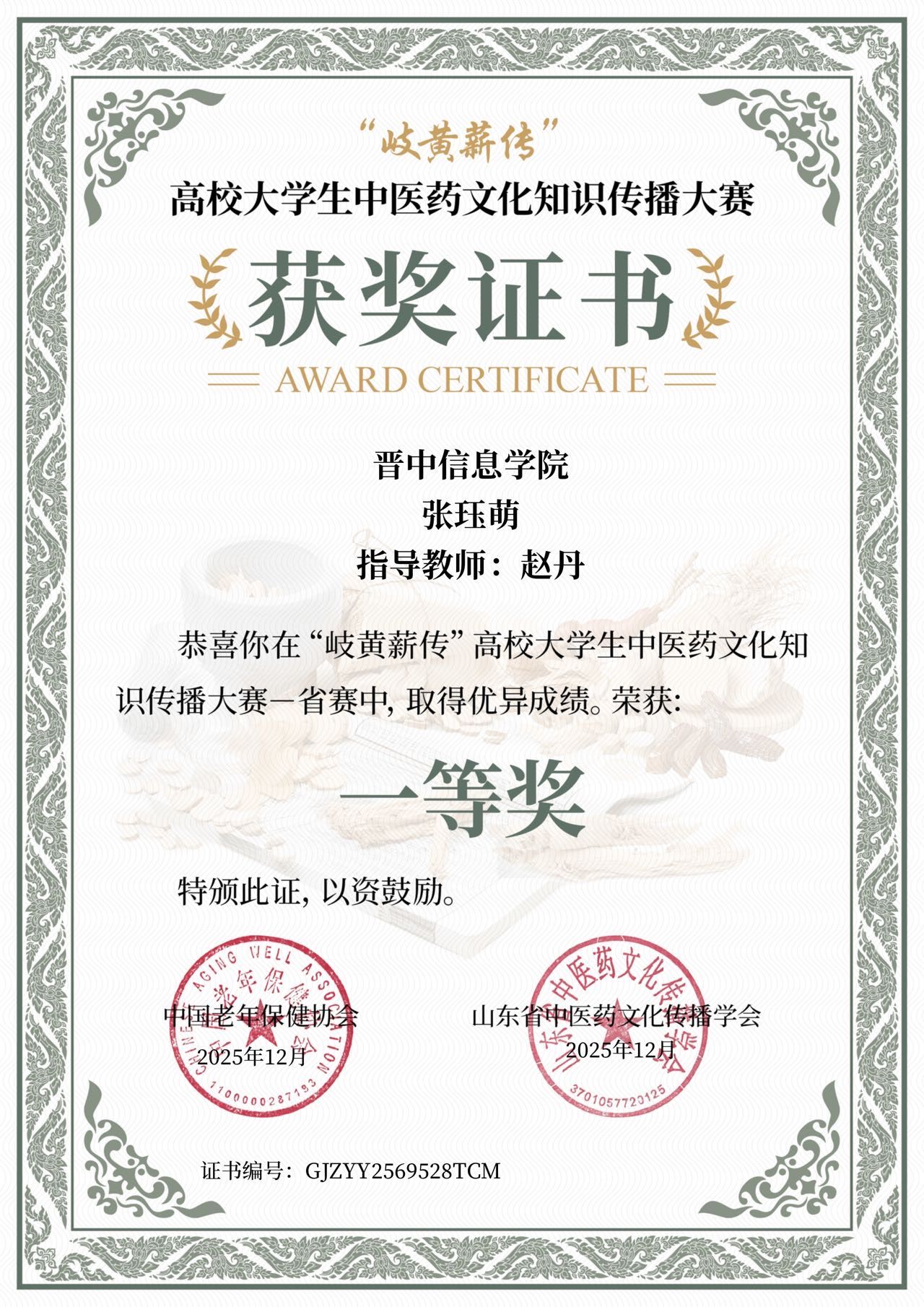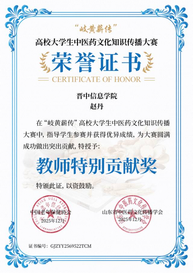 晋中信息学院大健康学院被赛事主办方授予“组织特别贡献奖”,指导教师张海明、张晋、安丽霞、赵永娟、李蓉、赵丹在大赛中指导学生参赛并获得优异成绩,为大赛圆满成功做出突出贡献,被授予“教师特别贡献奖”。组织参与此次大赛,不仅是对学生知识储备的检验,更是一次传承与创新的实践。