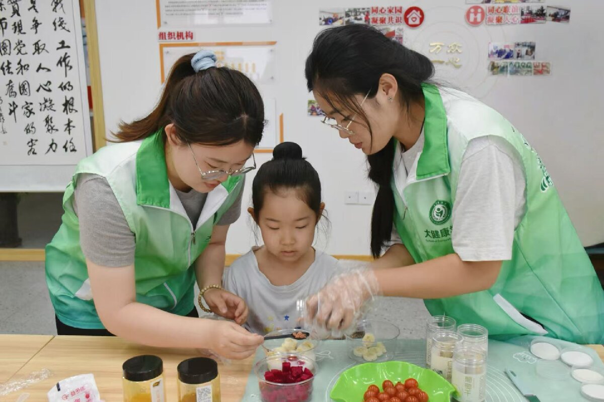 同时,针对社区居民日常饮食中蛋白质和膳食纤维摄入不足的问题,队员们系统科普了蛋白质、维生素等营养素对人体的重要作用,现场示范制作酸奶碗并讲解食材搭配原理。居民们亲手操作,为孩子打造出色彩丰富的“童趣酸奶碗”,在轻松互动中掌握了实用的营养搭配技巧。