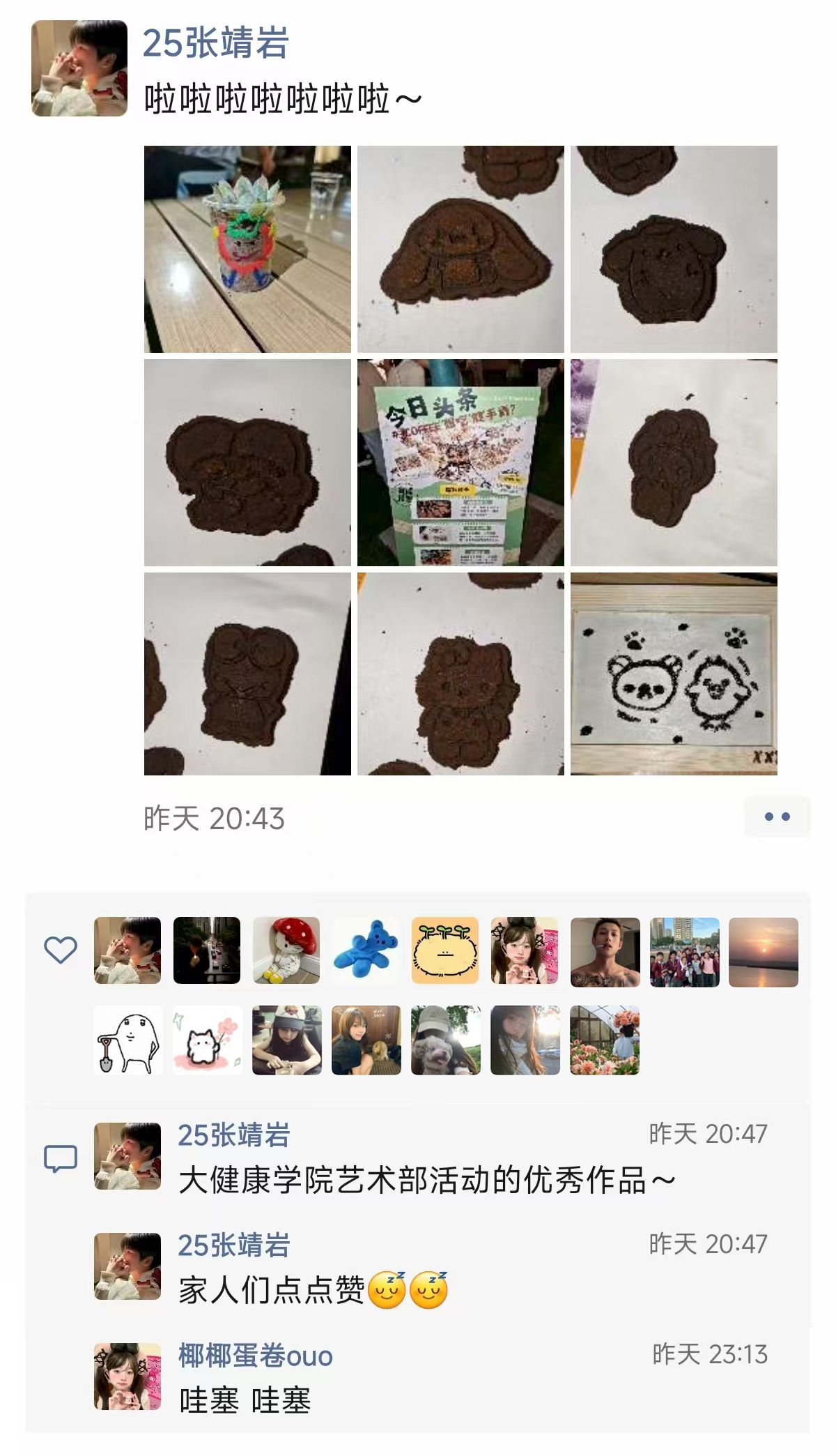 2025年9月15日,大健康学院于上河书院露天庭院举办“咖啡渣环保创意实践活动”,通过艺术创作形式推动咖啡废弃物资源化利用。活动以“健康生活与环保艺术的融合”为主题,吸引百余名师生参与,以创新实践重新定义青年群体的环保行动范式。