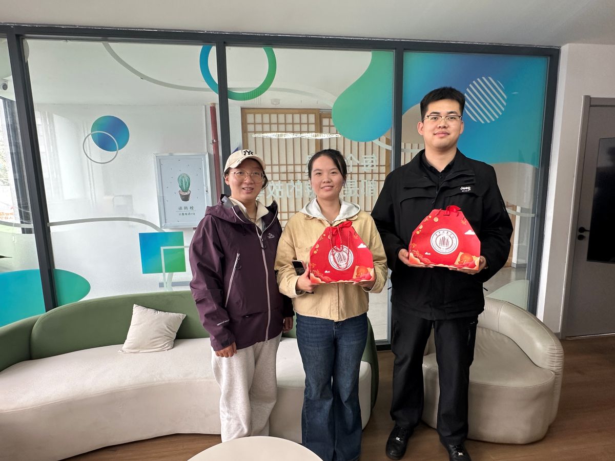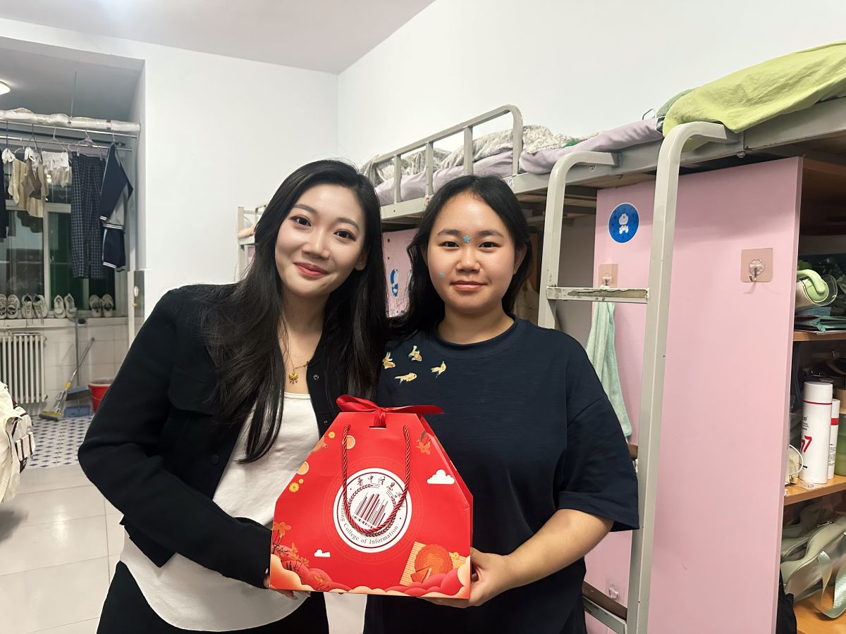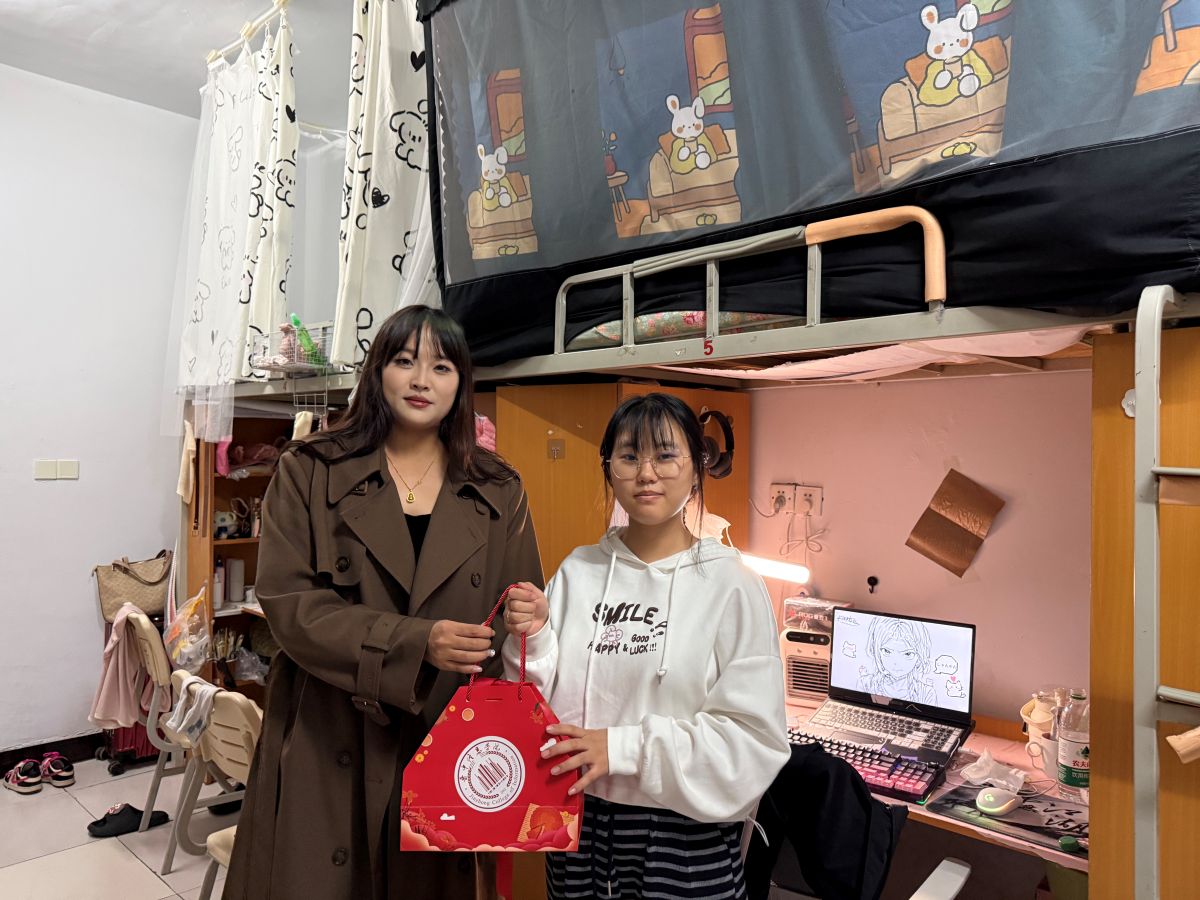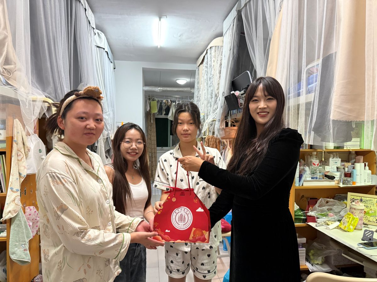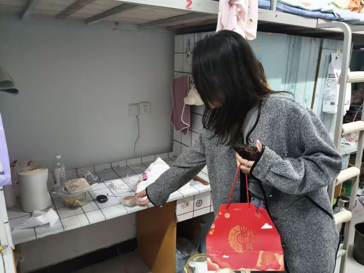 “咚咚咚——”宿舍楼寝室的门被轻轻敲响,正在整理考研笔记的大三学生抬头,看到辅导员老师拎着印着校徽的红色礼盒站在门口,“中秋国庆双节快乐!我们来给你送‘校园团圆礼’啦!”话音未落,一盒包装精致的月饼被递到手中,突如其来的温暖让学子瞬间笑眼弯弯。当天,辅导员老师和学生会志愿者为留校学子上门送上定制月饼与节日祝福,让宿舍楼道里满是团圆的暖意。