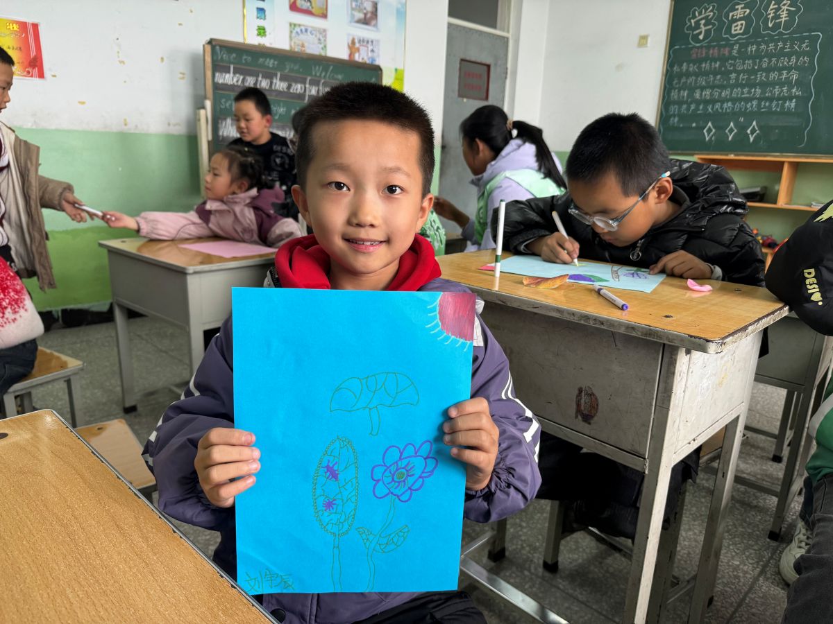 为了给孩子们营造更为广阔的创作天地,队员们精心准备了彩纸、黏土、画笔等多种多样的材料。这些材料井然有序地陈列在教室后方的桌子上,宛如一座微型的“创意宝库”。孩子们可以根据自己的兴趣和创意,自由挑选心仪的材料进行创作。有的孩子青睐彩纸,专注地折叠出栩栩如生的小兔子和精致的小纸船;还有的拿起画笔,在画纸上勾勒出蔚蓝的天空、洁白的云朵、繁茂的花草和挺拔的树木,尽情抒发着对美好事物的无限想象。