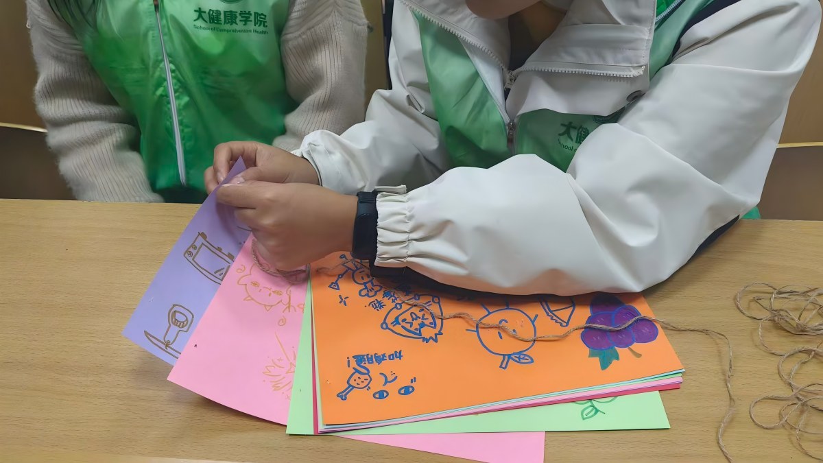 活动尾声,志愿者细心收集起所有情绪密卡,将它们整齐摆放,一针一线地将其缝制成册。穿针引线间,仿佛把大家的快乐、平静、期待都编织成了珍贵记忆。志愿者认真写下名称与制作日期,这本精致的线装书,不仅承载了同学们的万千心绪,更让陌生的彼此因共同的体验拉近距离,凝聚起浓浓的集体暖意。
