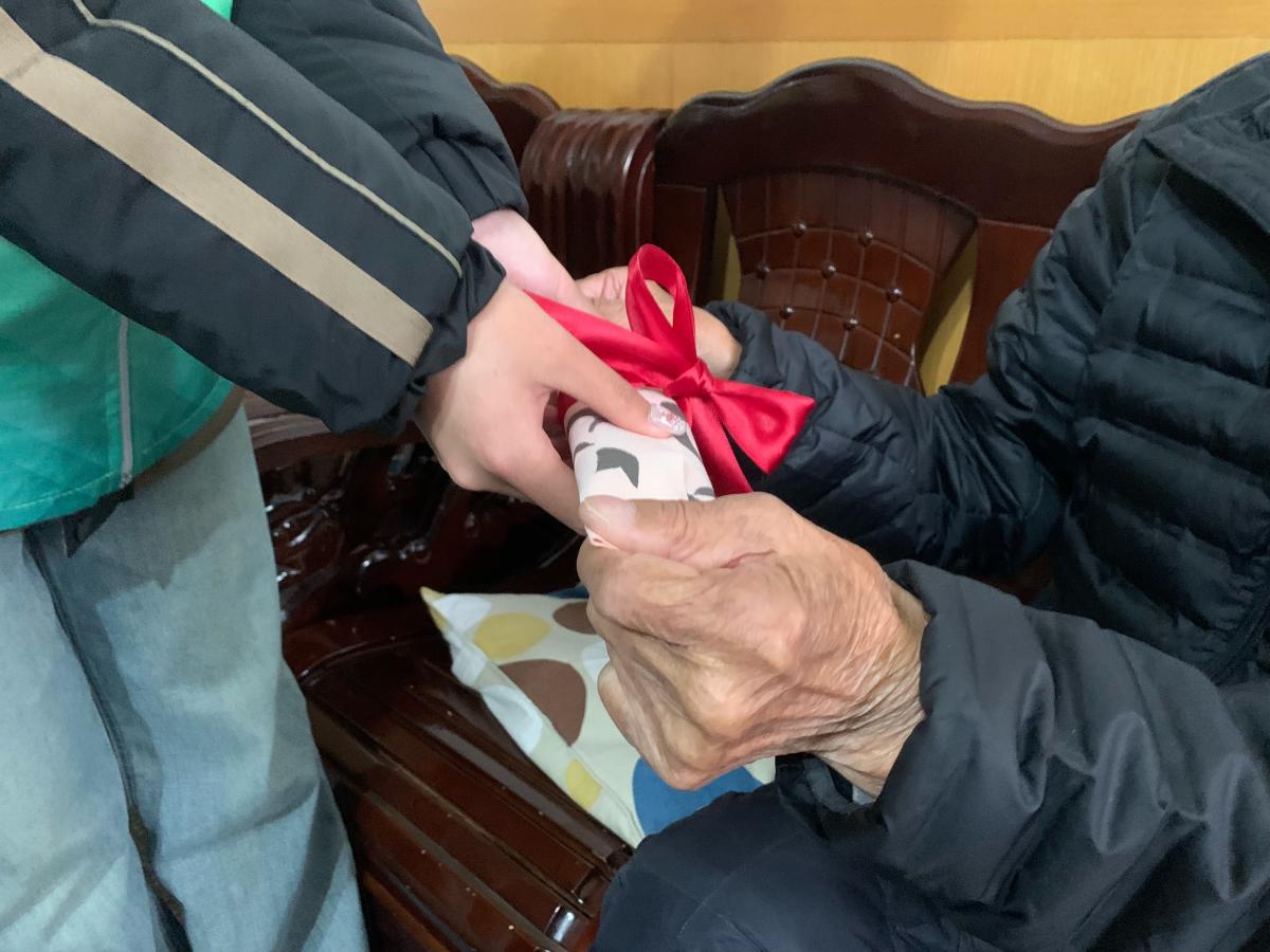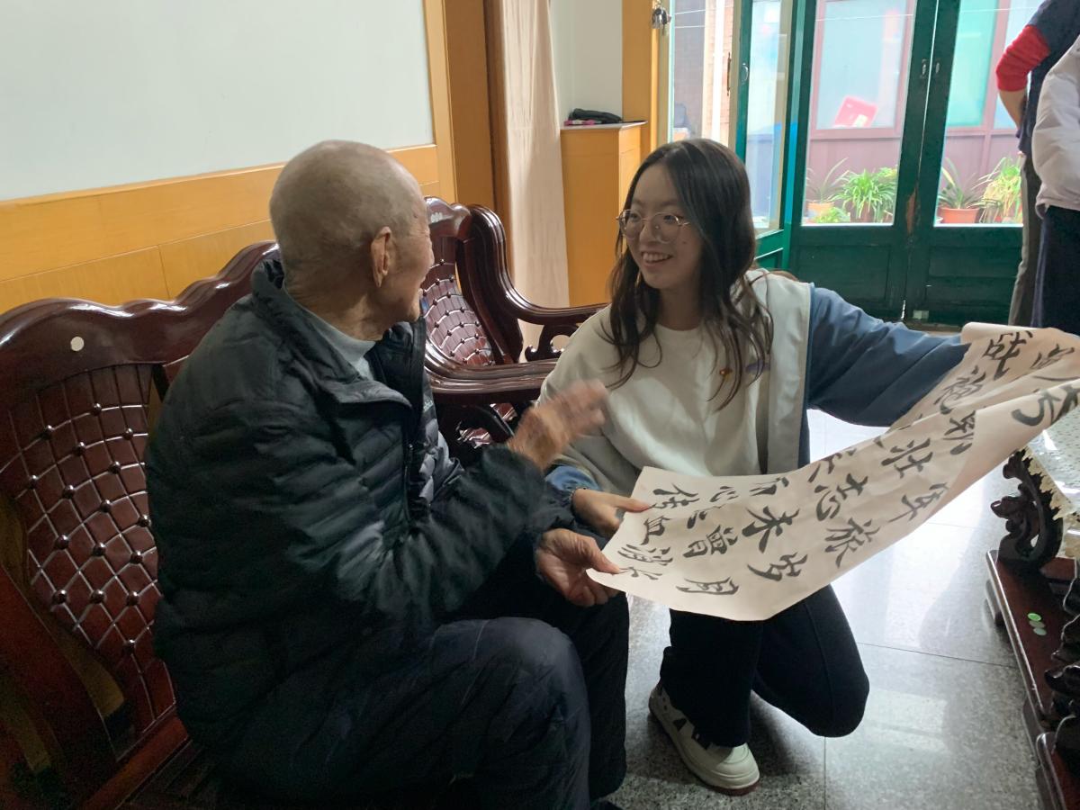 当耳畔的岁月絮语渐歇,温馨的赠礼时刻便悄然铺展。志愿者们将精心创作的毛笔字作品郑重递到老人手中,笔锋流转间,不仅是青年学子扎实的书法功底,更满盛着对这位英雄的崇高敬意与深切祝福。老人手捧作品,指尖轻抚宣纸字迹,眉眼间满是被铭记的欣慰,这份跨越代际的心意,在秋日的房间里悄然升温,化作最动人的情感共鸣。