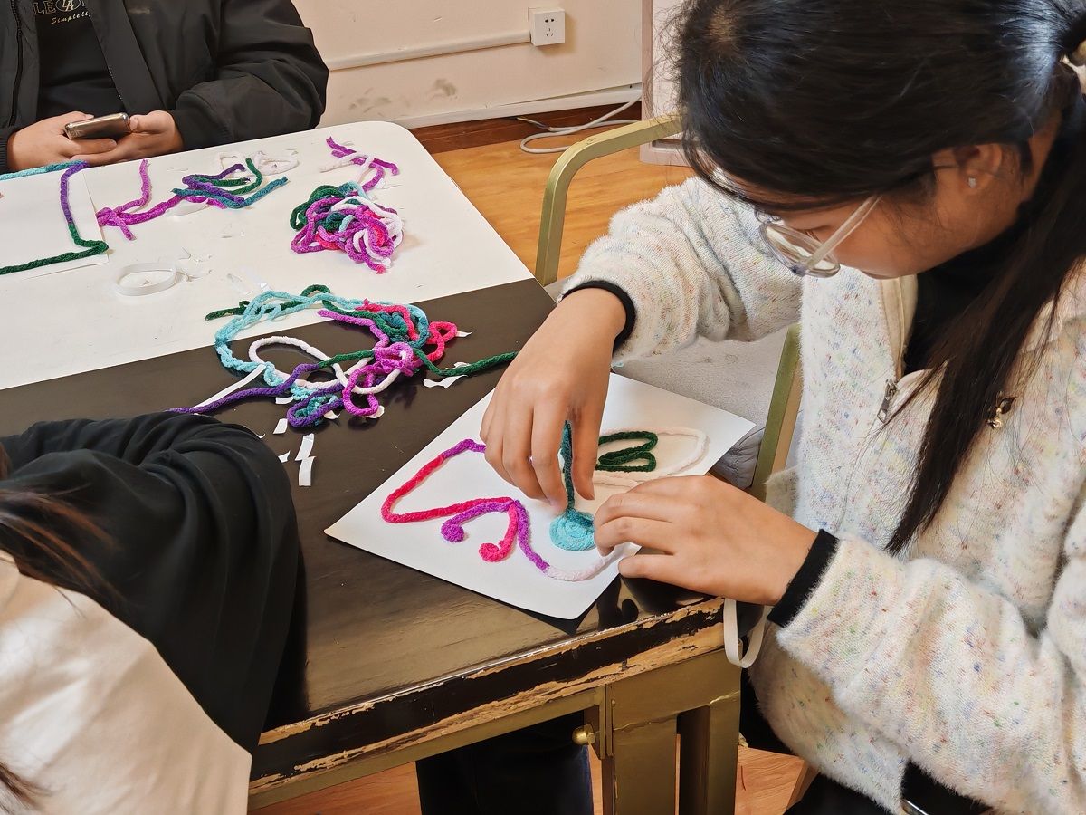 进入创作环节,同学们围绕“青春”这一主题,充分发挥自己的想象力和创造力。有的同学巧妙地用彩色毛线编织出象征梦想的翅膀,寓意着在青春的天空中勇敢追逐理想;有的同学则以布料边角料粘贴成青春纪念册的模样,将校园里的美好回忆一一复刻;还有的同学通过不同颜色和材质的搭配,打造出充满活力与个性的纤维作品。在创作过程中,大家全神贯注,沉浸在自己的艺术世界里,不时相互交流灵感,分享创作心得。整个工坊内洋溢着浓厚的艺术氛围,每一件作品都凝聚着同学们对青春的独特理解和感悟。