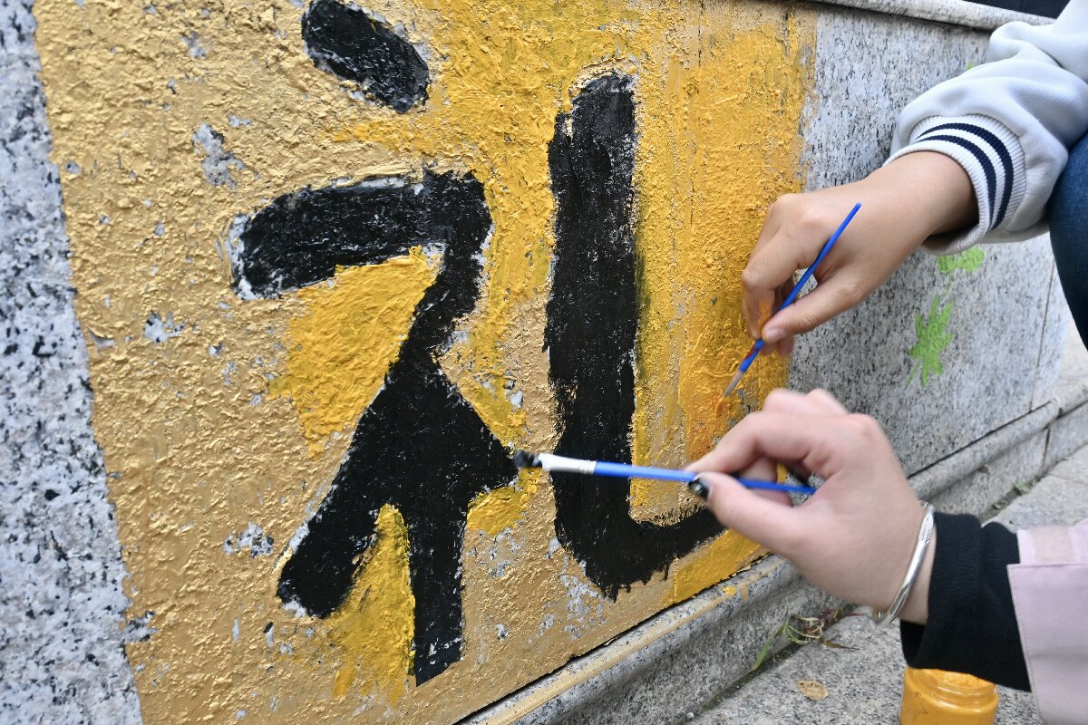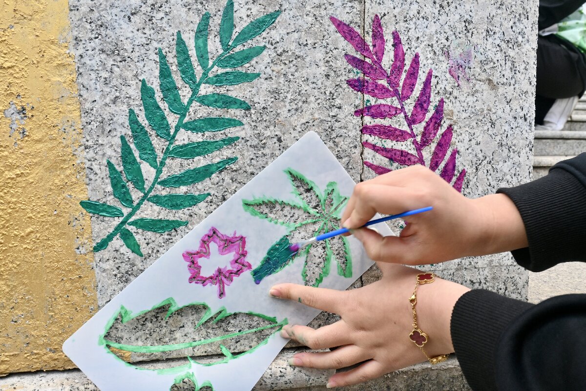 人来人往的喧嚣里,墙面涂鸦成了独特的驻足点。行人片刻停留,就能从藤蔓缠水滴的画面感受生态共生,从花卉旁的标语知晓低碳要领。抽象的环保理念借由生动视觉摆脱晦涩,变得易懂易记易扩散。同学们创作时,从小心勾线到洒脱上色,从忐忑试探到全心投入,既为墙面注入生机,也释放学业压力、重拾创作喜悦,让环保教育与情绪疏导的双重价值自然实现。