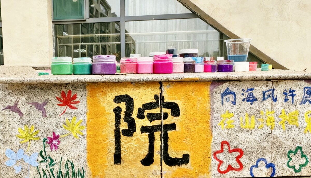 墙面涂鸦以基础预处理为首要工序,通过清洁花坛外围墙面去除污渍,调控墙面基底粗糙度,为后续颜料均匀附着筑牢基础。队员们先以铅笔勾勒藤蔓、水滴、花卉轮廓,再逐层填色,浅绿铺藤蔓、深绿勾脉络、粉黄红染花瓣,让画面鲜活灵动。原本素净单调的白色墙面,在一笔一画的精雕细琢与色彩晕染中,慢慢褪去沉闷、焕发光彩,最终化作一方传递环保知识的“立体看板”。