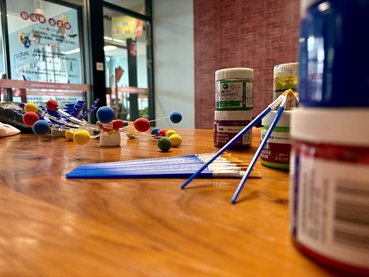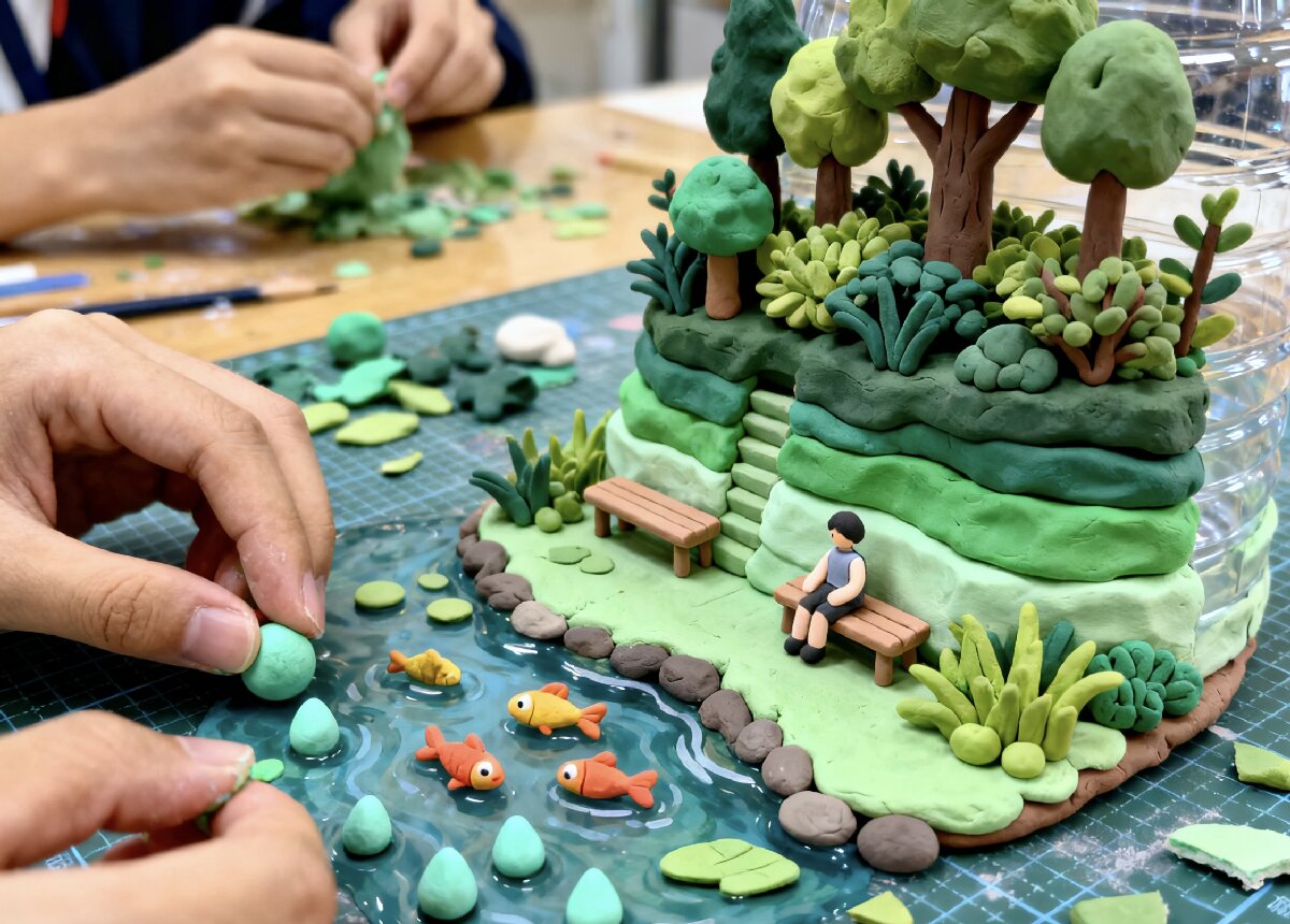 塑料瓶改造的最后一笔颜料晾干时,粘土创作随即接棒,将生态构想从抽象概念落地为具象模型。水生态模块中,小块粘土先被搓成圆润水滴,再与扁形粘土捏合的小鱼精准贴合,生动模拟出“水与生物”的共生关系,直观呈现校园水系生态的基础构成;植被层级模块则严格遵循自然比例,用浅绿粘土贴附出底层 “地被植物”,深绿粘土塑形中层“灌木”,最后以少量粘土点缀顶层“乔木”,完整复刻校园本土植物群落的垂直结构;人文互动模块由队员魏语函主导创作,她将长条粘土搓压成迷你“休憩座椅”,巧妙嵌入模型场景,既丰富了生态场景的实用性,也体现了“人与自然和谐共处”的设计理念。