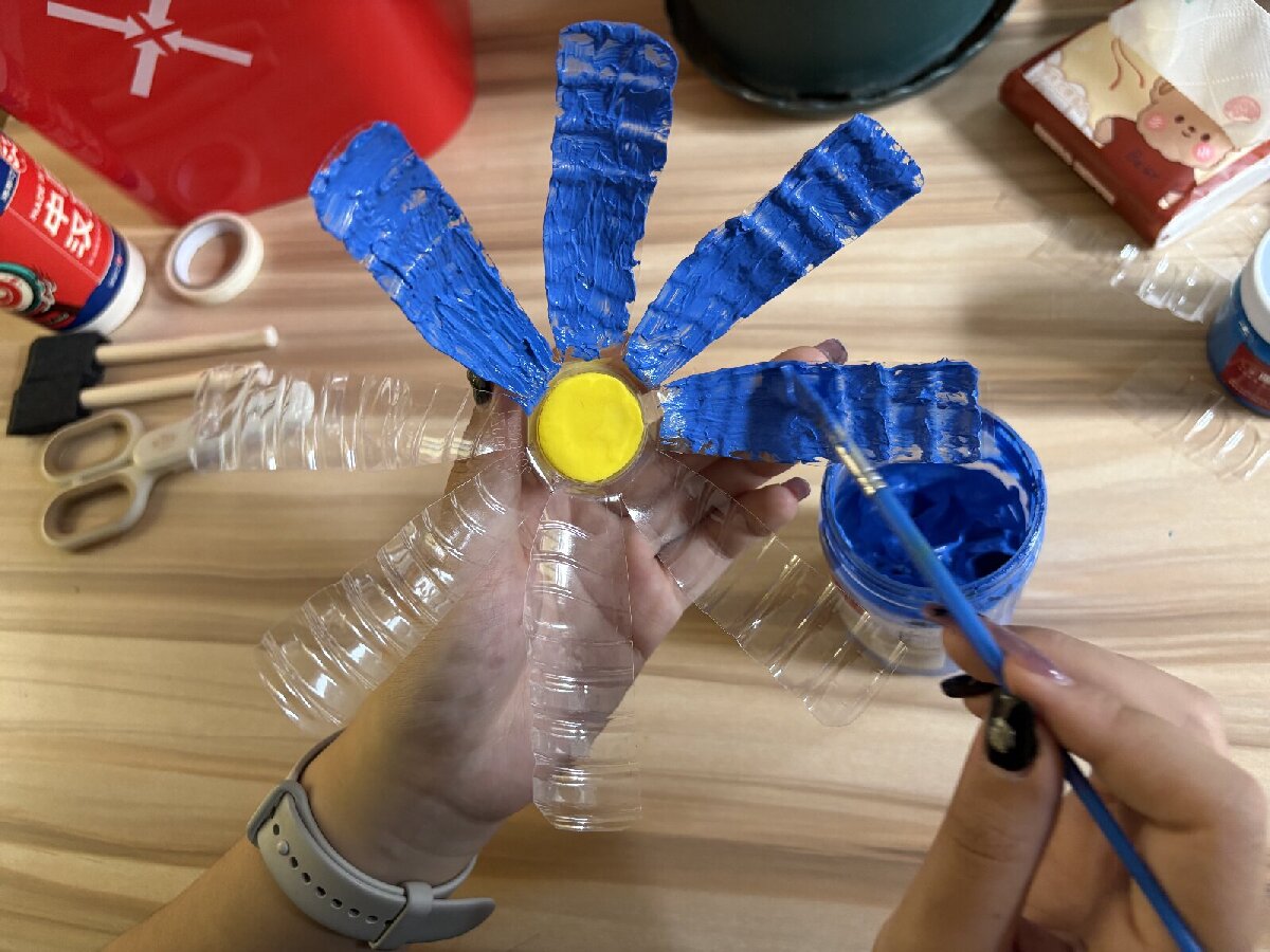 当第一把剪刀落在塑料瓶上,改造的序幕正式拉开。以“预处理、加工、美化”流程推进,按预设尺寸完成裁剪与边缘钝化处理,确保基材安全性与实用性。美化阶段选用环保型丙烯颜料,先勾勒图案轮廓,再通过分层上色的手法,让瓶壁上的藤蔓缓缓舒展、太阳花逐步显形,赋予塑料瓶鲜活的生态质感。往日的生活垃圾,在指尖流转间褪去旧貌,化作形态各异的“花器”,“变废为宝”的环保理念,也顺着画笔与剪刀的轨迹悄然扎根。