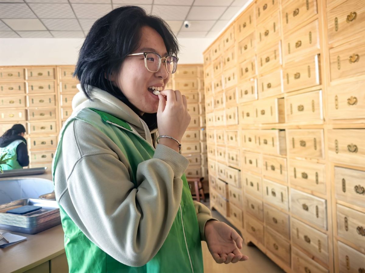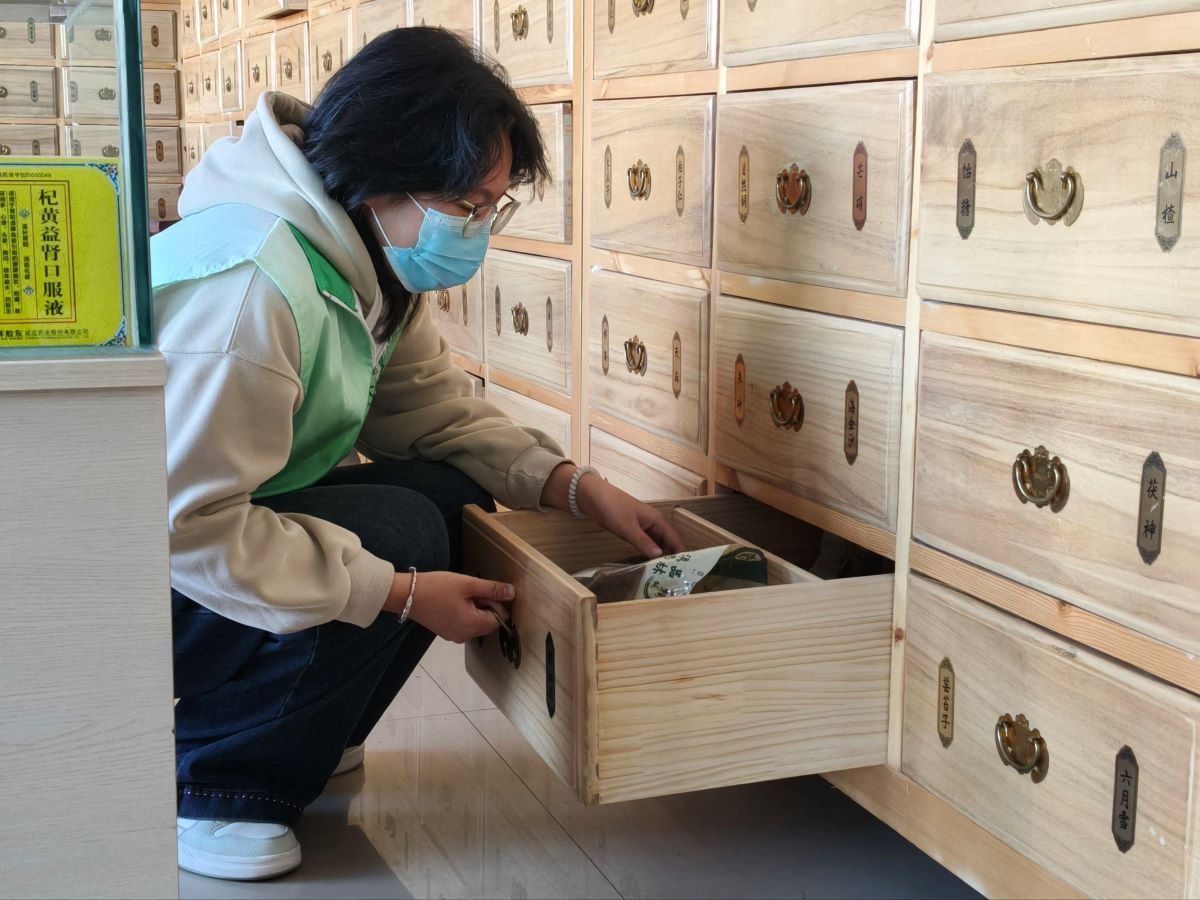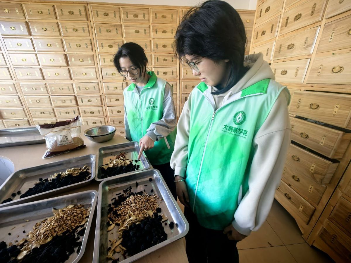 志愿者的身影在药香间灵动穿梭,指尖轻触药材,好奇追问,拆解学习着药材分类与贮存的隐秘:数百种饮片在“看、闻、摸”的轻触里苏醒,秋日润肺的银耳百合、冬日御寒的黄芪当归,寻常食材里蜷着的养生密钥,便在鼻息与指腹间,一一舒展成可触的暖意。