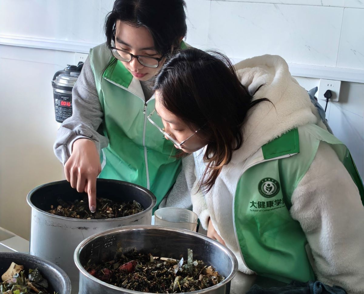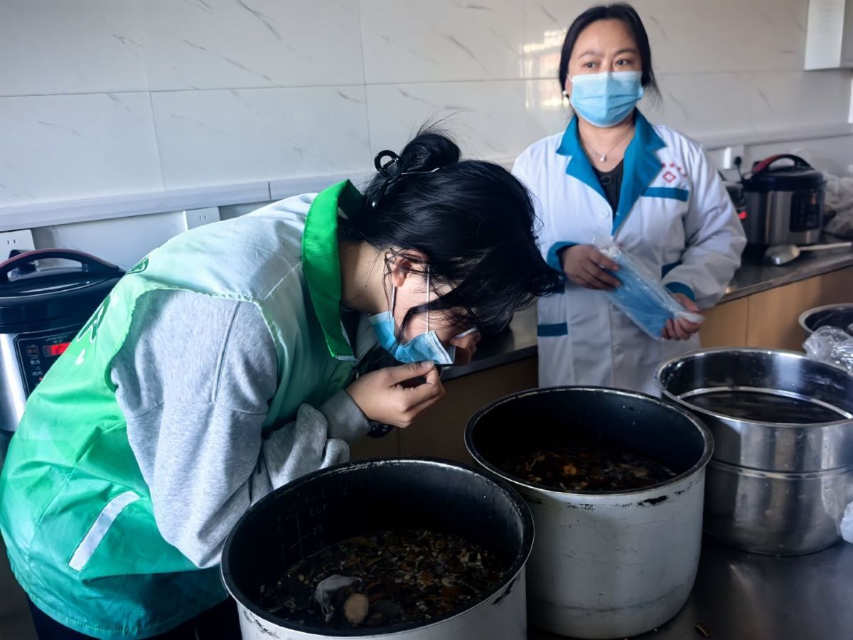 氤氲的药香在煮药室里缓缓流淌,志愿者们围在药师身旁,认真聆听着药材配伍的门道。志愿者精准称量每一味药材,“解表药要轻煎,滋补药需久熬,火候得跟着药性走。”志愿者们小心翼翼地将药材投入药罐,药材在水中渐渐舒展,苦涩中带着清香的药味愈发浓郁。药师叮嘱“头煎武火煮沸,再用文火慢炖半小时”。当药香达到最浓郁时,分装到干净的容器中,每一滴都凝聚着耐心与暖意。