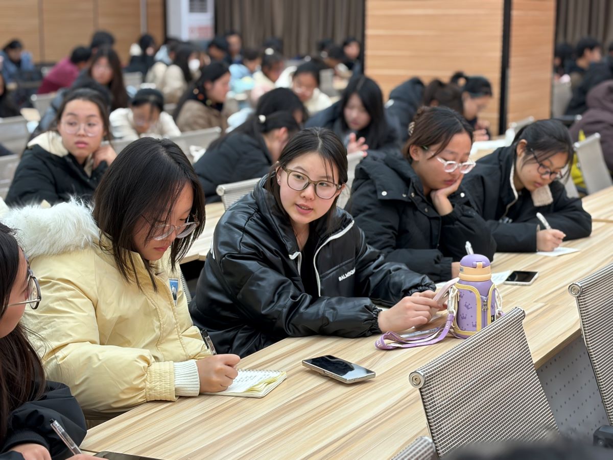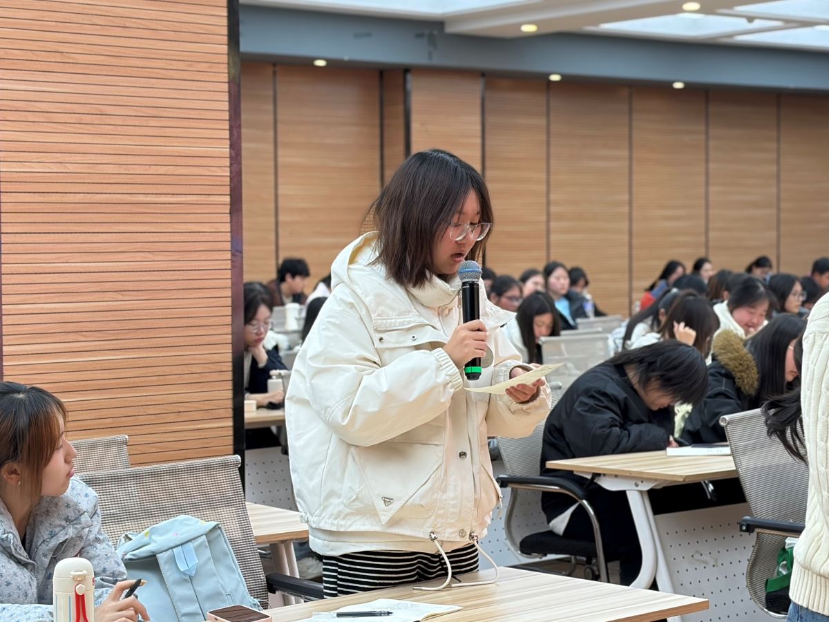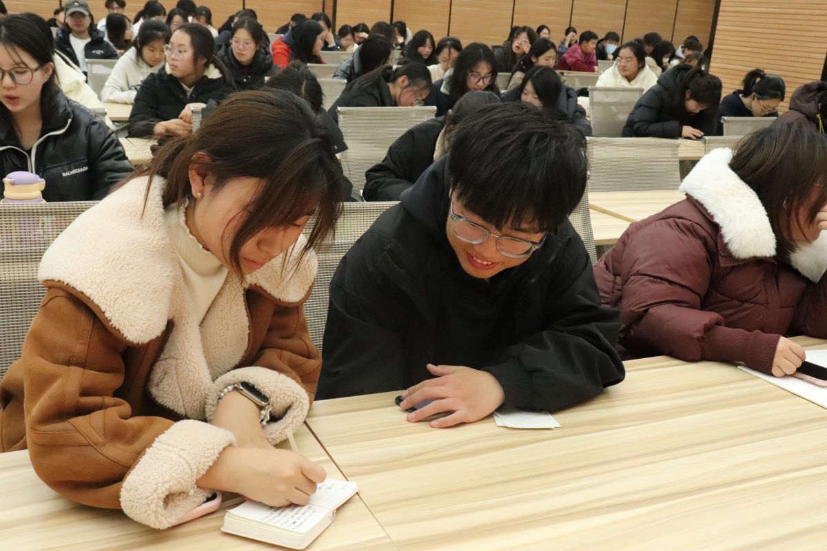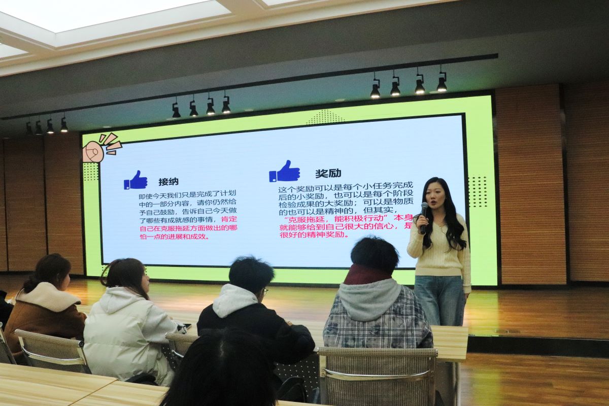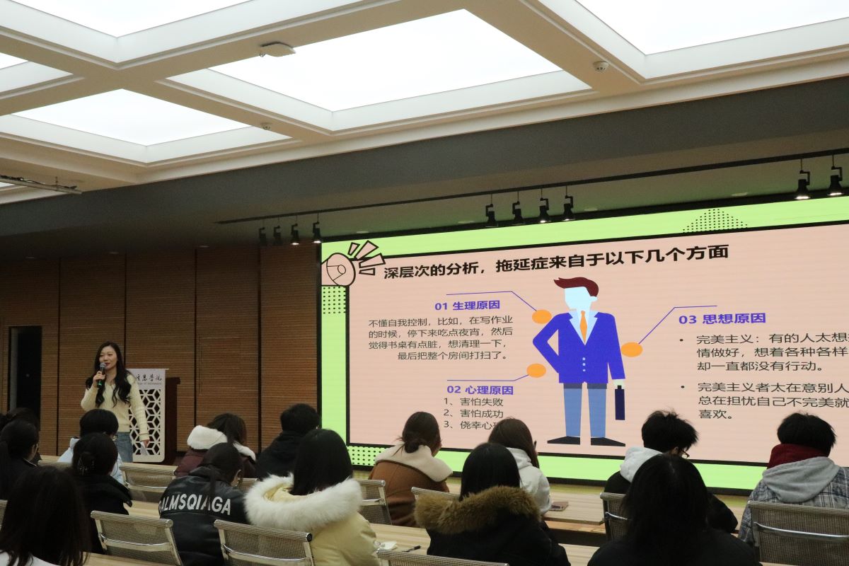在原因剖析环节,常佳老师进一步从生理、心理、思想三维度深挖根源:生理上的自我控制薄弱,让琐事打断既定节奏;心理上的害怕失败、侥幸心理,成为行动的“隐形绊脚石”;思想上的完美主义执念,则让人在“万事俱备”的等待中错失良机。现场开展的拖延症小测试,以10项具体表现为标尺,让同学们清晰认知自身状况——轻度拖延需防微杜渐,中度拖延要咬牙改变,重度拖延则需重新审视自我,为精准施策筑牢基础。