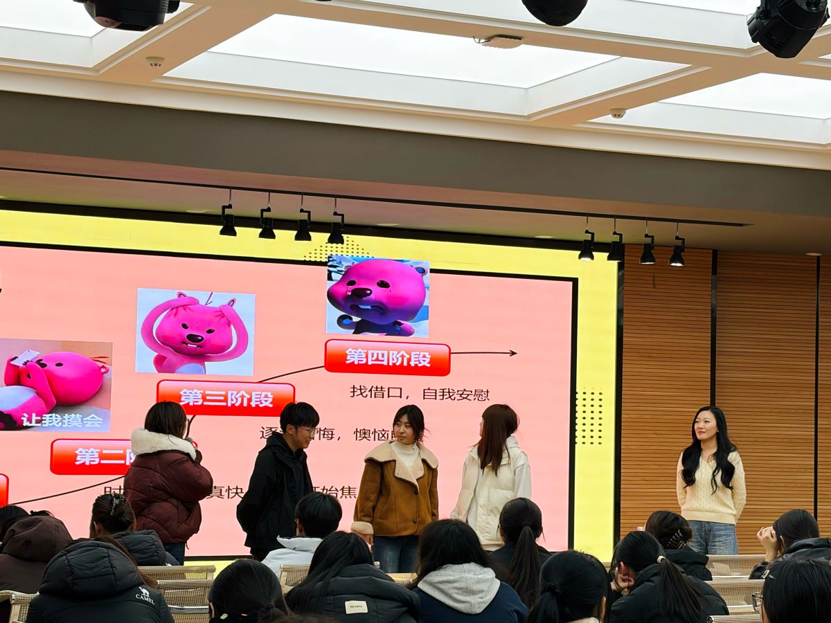 ctrl+c这一核心快捷键被巧作引线,为整场话题的展开铺就了生动开篇,自然引出常佳老师的精彩分享,随后用一组直击校园日常的场景画面便引发全场共鸣:“再睡5分钟”的起床拉锯战、“先放松片刻”的学习拖延症、“稍后再整理”的生活惰性……那些藏在时光缝隙里的拖延瞬间,让同学们在会心一笑中纷纷“对号入座”。随后,常佳老师精准界定拖延与拖延症的边界,指出拖延症是“明知其害而为之”的自我消耗——明知会引发负面结果,却仍难按时达成目标,最终陷入自我否定的情绪漩涡。从最初的满怀自信,到时光流逝后的焦虑不安,再到任务逾期后的懊恼自责,最后以自我安慰潦草收场,常佳老师精确拆解了拖延四阶段,邀请同学们进行了情景演绎,同时也邀请同学分享了她拖延的心路历程,深刻揭示了其背后“拖延—目标落空—信心受挫”的恶性循环。