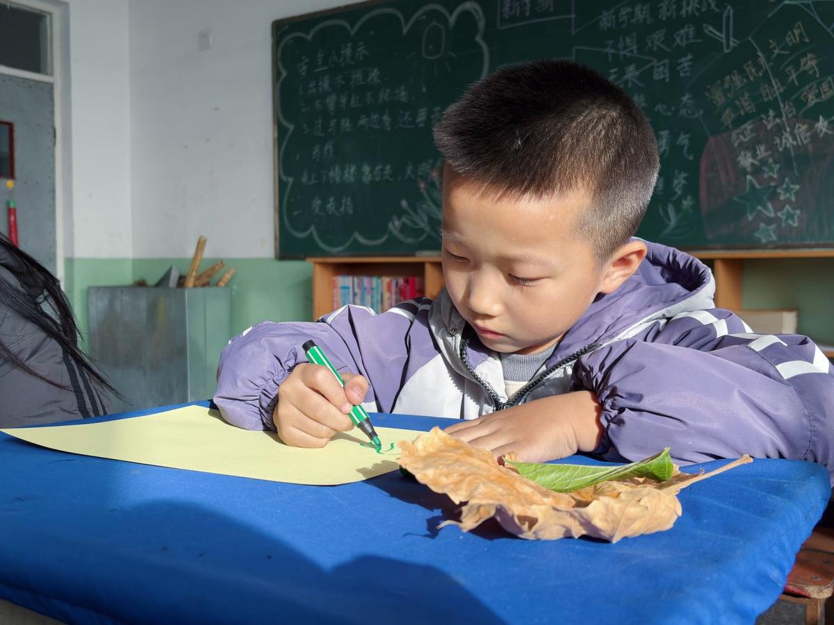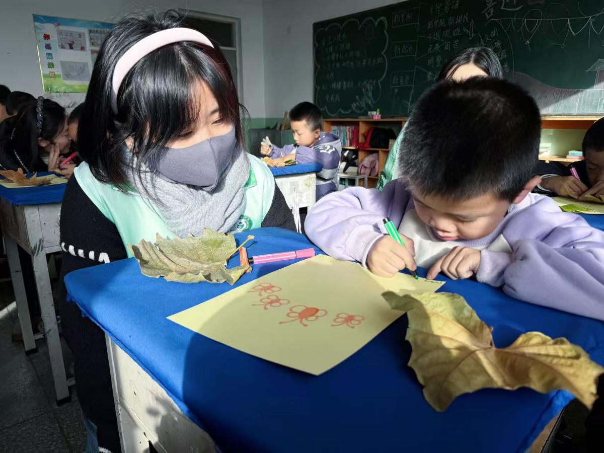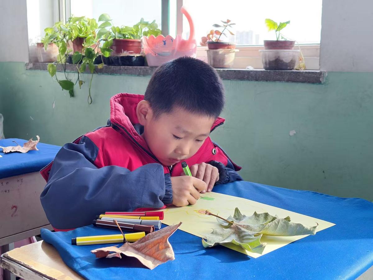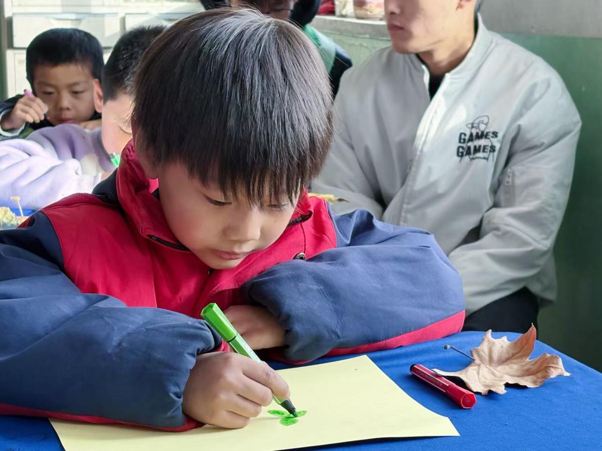 当金黄的落叶遇上灵动的童心,这个冬天便有了别样的精彩。志愿者们俯身甄选叶片,搭配色彩与纹理的和谐;孩子们开动创意构思布局,将落叶拼贴成冬日花丛等意象;辅以彩笔勾勒,让自然肌理与创意想象碰撞出独特火花。每一幅作品都承载着孩子们对自然的观察与感悟,教室里满是专注的神情与轻声的讨论。