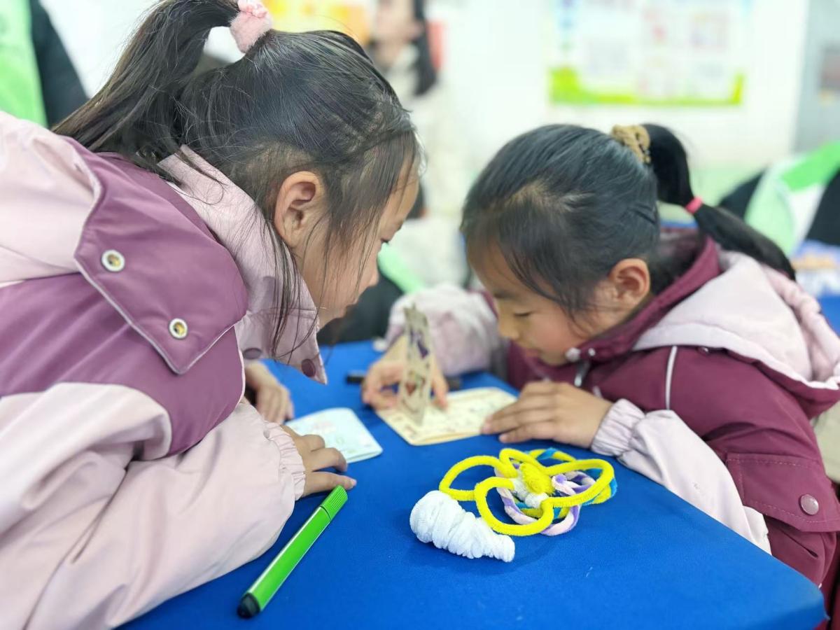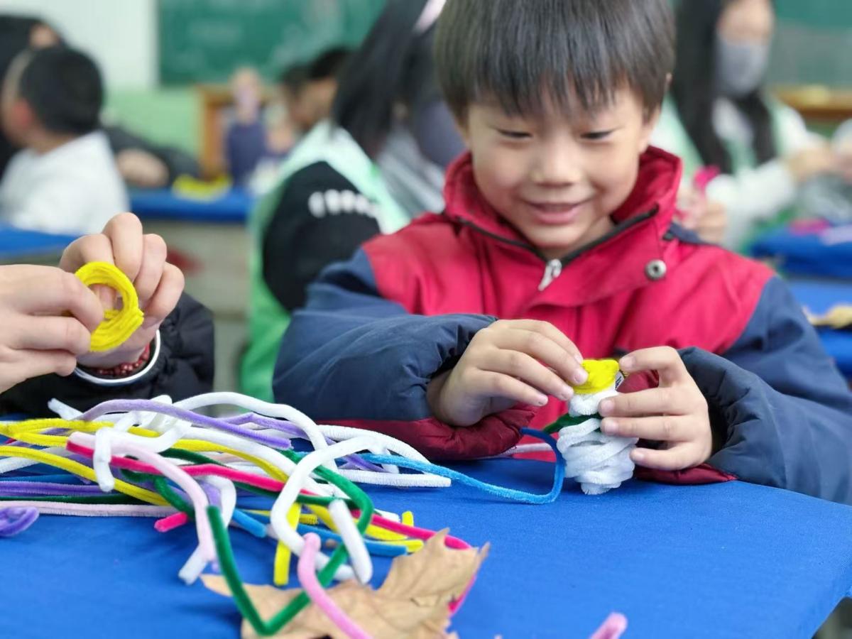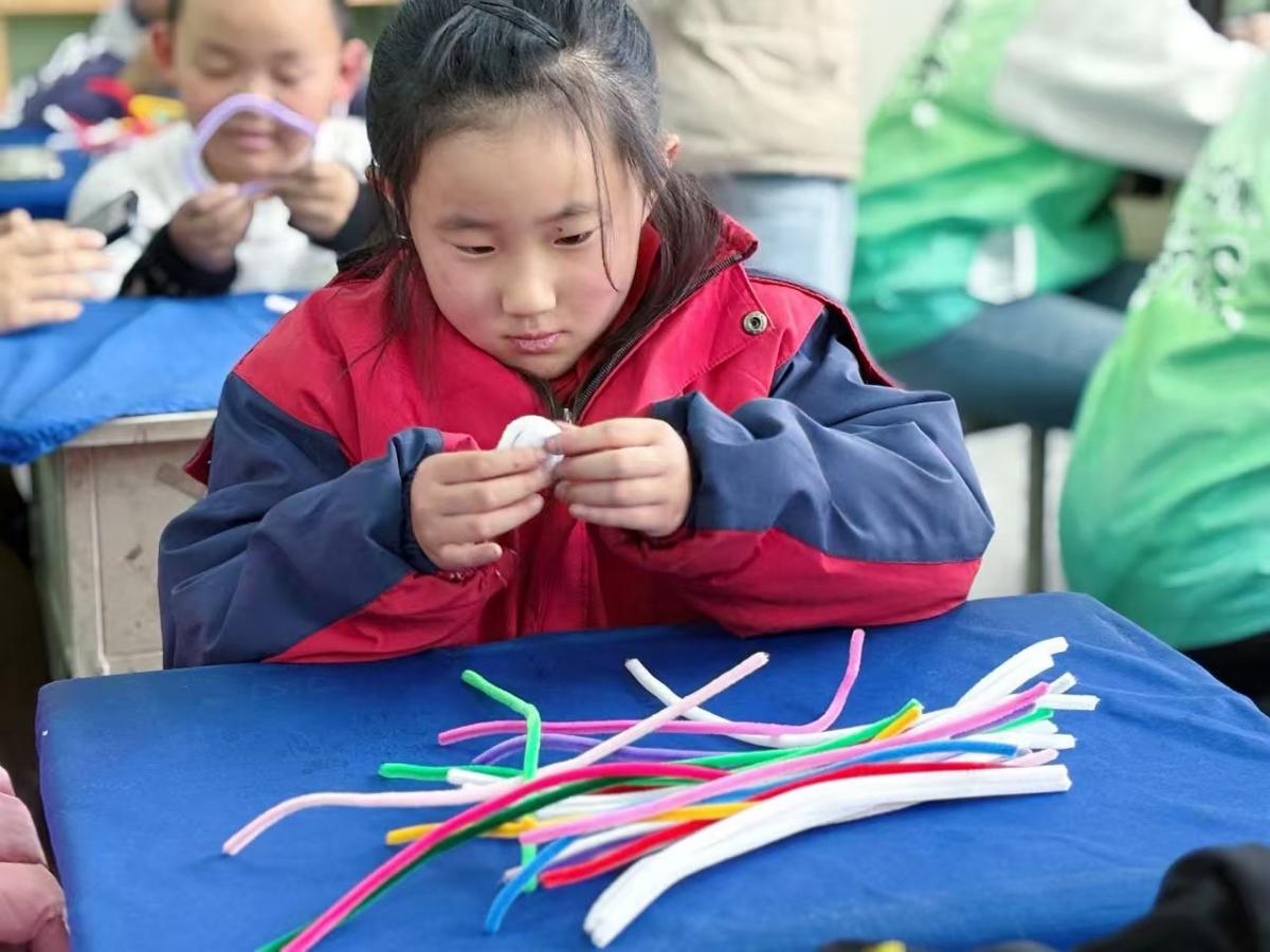 “以柔性之材,塑冬日之美。志愿者以诗意化的引导开启扭扭棒魔法创作之旅,仅示范弯折、缠绕等基础技法,便将创意的主动权完全交予孩子们。彩色扭扭棒在稚嫩的手中灵活流转,白色化作晶莹雪花,红色缠绕成温暖围巾,黄色拧成暖阳微光,绿色勾勒出松枝新绿,一个个充满冬日意蕴的小物件应运而生。
