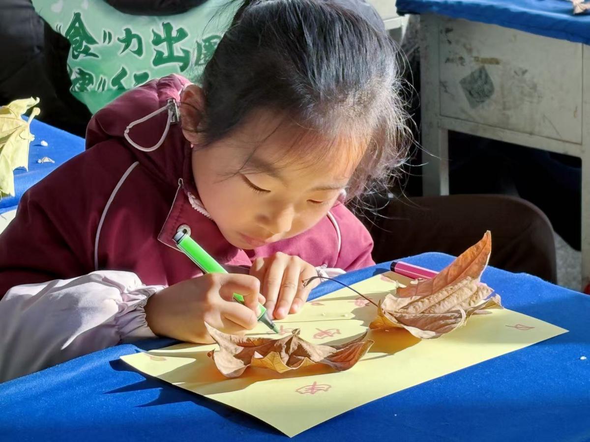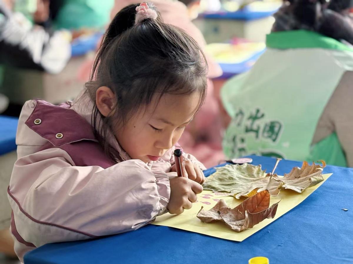 一位扎着小辫子的女孩,将不同形状的落叶拼成了一棵“冬日大树”,田晋荣蹲下身,耐心夸赞她的创意,鼓励她用彩笔添加更多细节。在这场与自然的对话中,孩子们不仅学会了观察落叶的形态、色彩之美,更在动手实践中锻炼了想象力与创造力,让冬日里的自然馈赠成为艺术创作的珍贵素材。