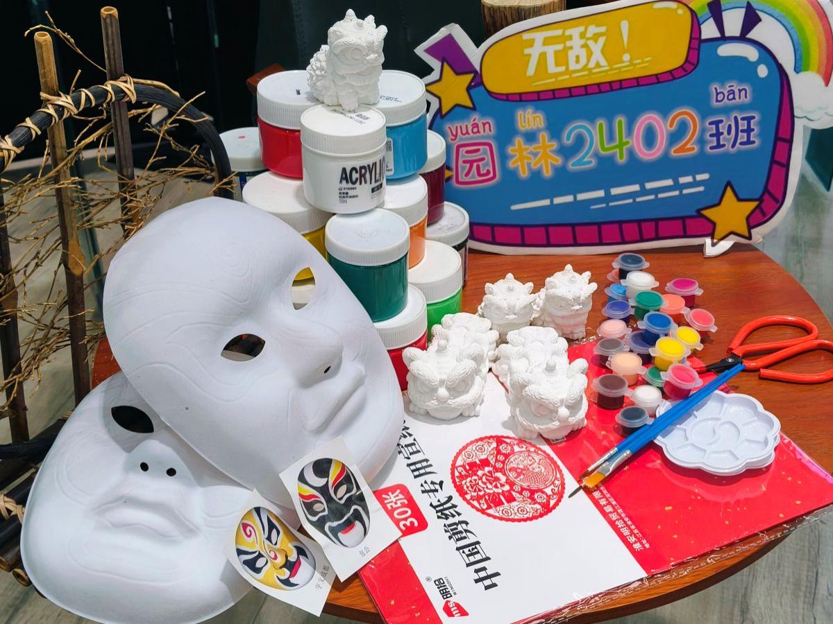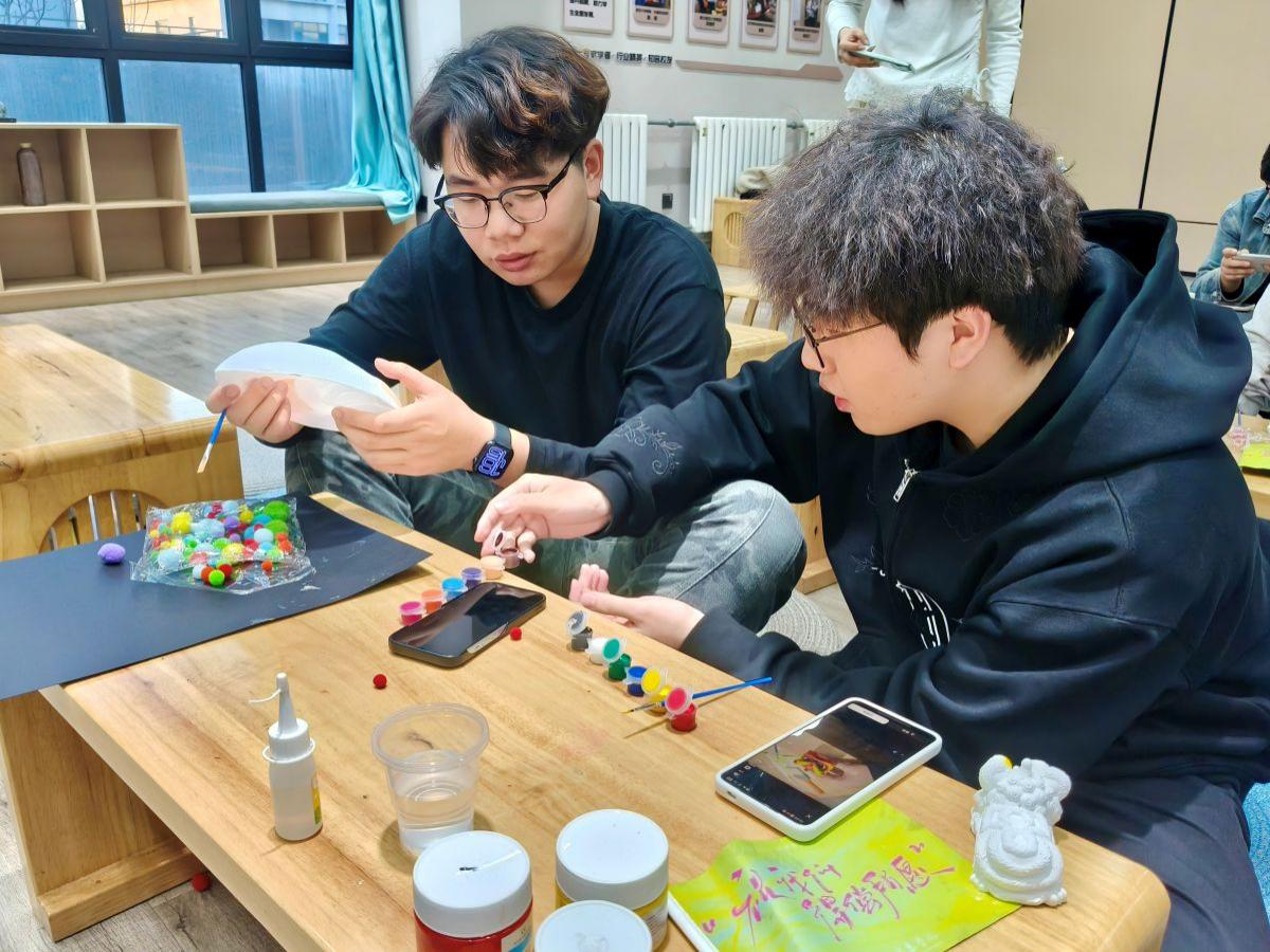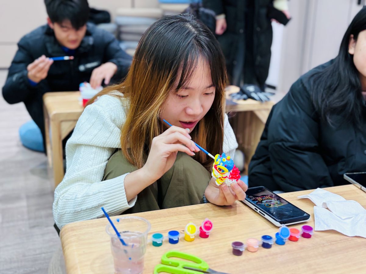 活动现场暖意融融、创意涌动,红纸、剪刀、石膏坯体等材料整齐铺陈,传统非遗的古朴与青春潮流的鲜活在此碰撞交融。同学们执剪凝神,折叠红纸细酌剪裁角度,指尖翻飞间,一件件兼具传统韵味与青春气息的作品应运而生。醒狮石膏彩绘时,沿用经典配色彰显喜庆,或融入渐变、撞色等现代设计,让非遗在画笔间焕发新彩。脸谱绘制中,同学们既还原经典脸谱的线条色彩,也结合现代审美大胆创新,深度体悟戏曲非遗的深厚底蕴与艺术魅力。