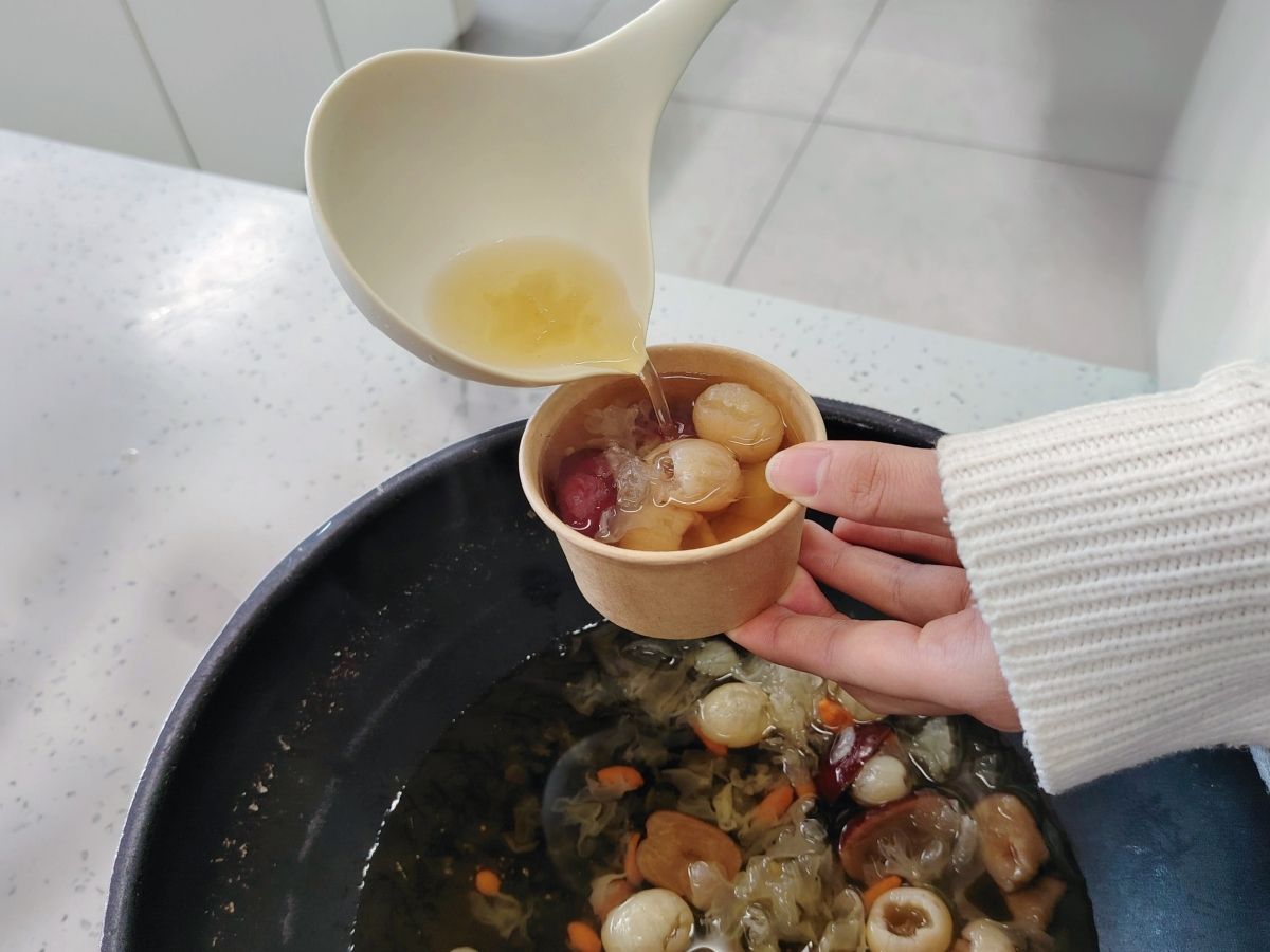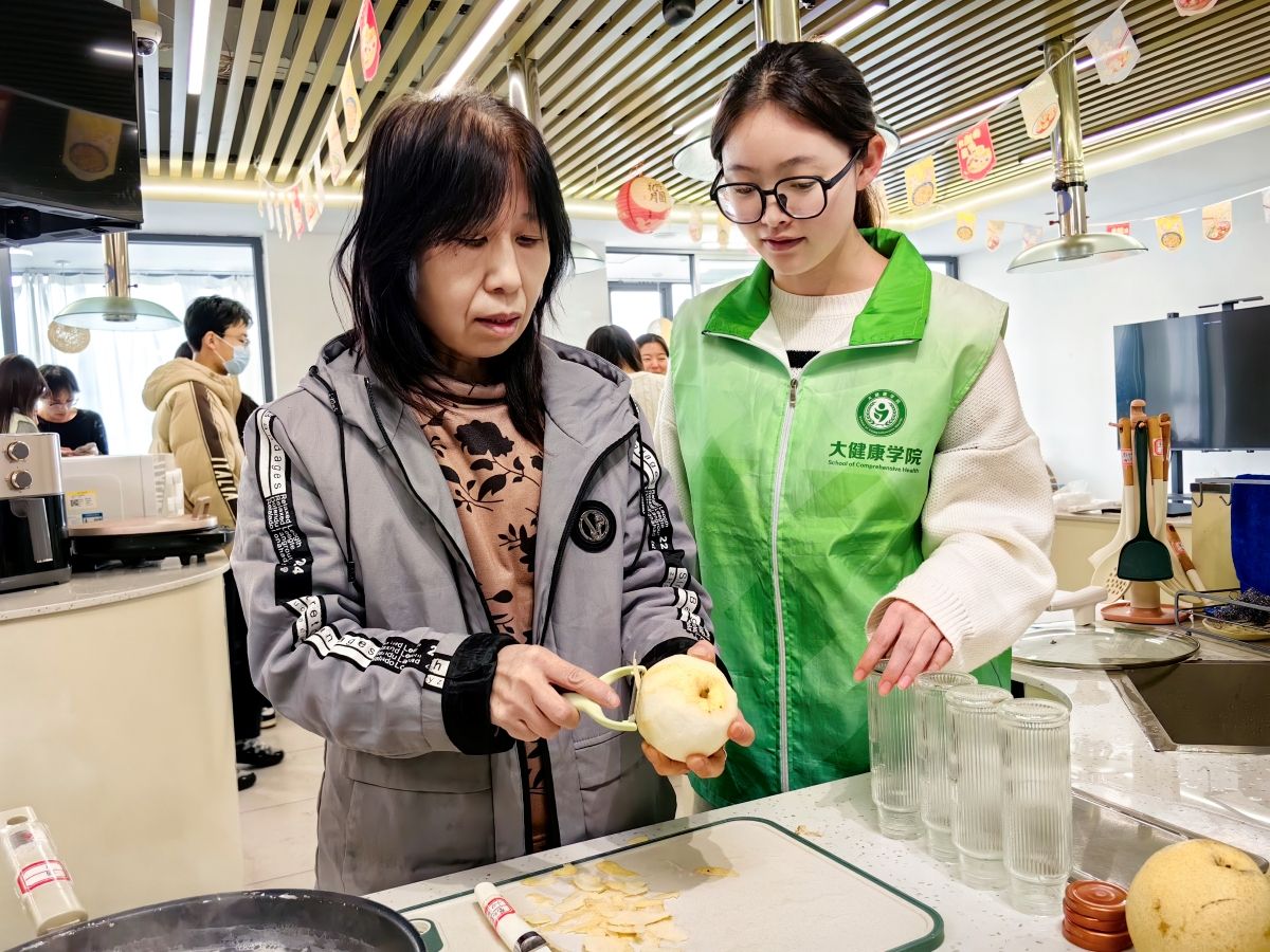 从“秋冬干燥需润肺补气,梨与红枣是王炸组合”的食材搭配,到“食材清洗要较真,火候把控藏营养”的食安要点,再到“早眠晚起养阳气”的作息建议,专业知识被融入趣味科普,互动氛围热烈。同学们演示红枣去核、银耳泡发等操作要领,耐心讲解“桂圆久煮易失清甜”等门道;阿姨们化身认真“学徒”,俯身观察、模仿操作,现场满是指尖相授的专注与真诚。经过精心炖煮,琥珀色的桂圆红枣茶与胶质满满的银耳雪梨羹新鲜出炉,阿姨们将第一碗甜汤递到同学们手中,温热甜汤交织着醇厚甘润与清润回甘,暖透冬日寒凉。