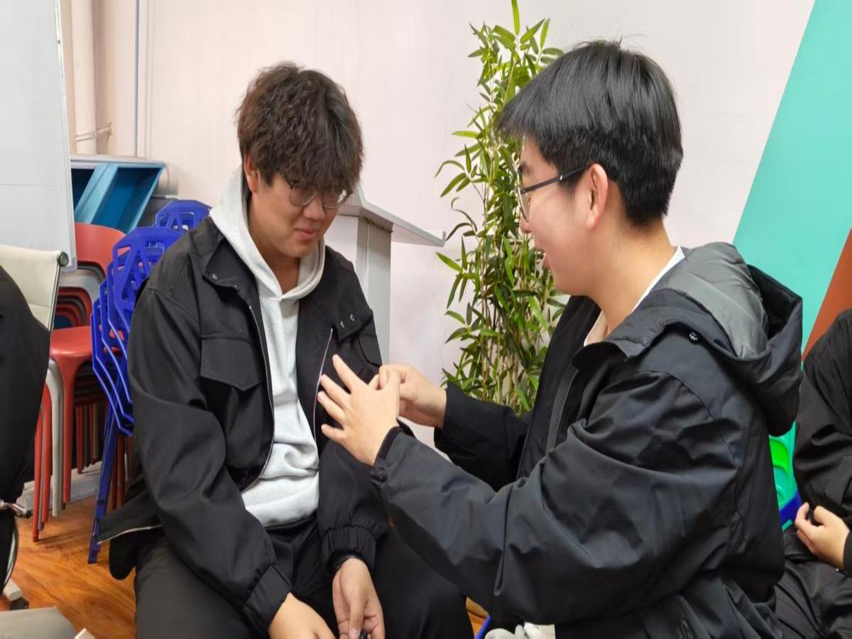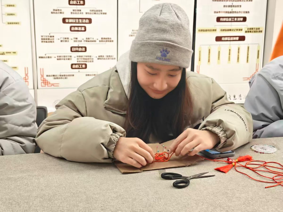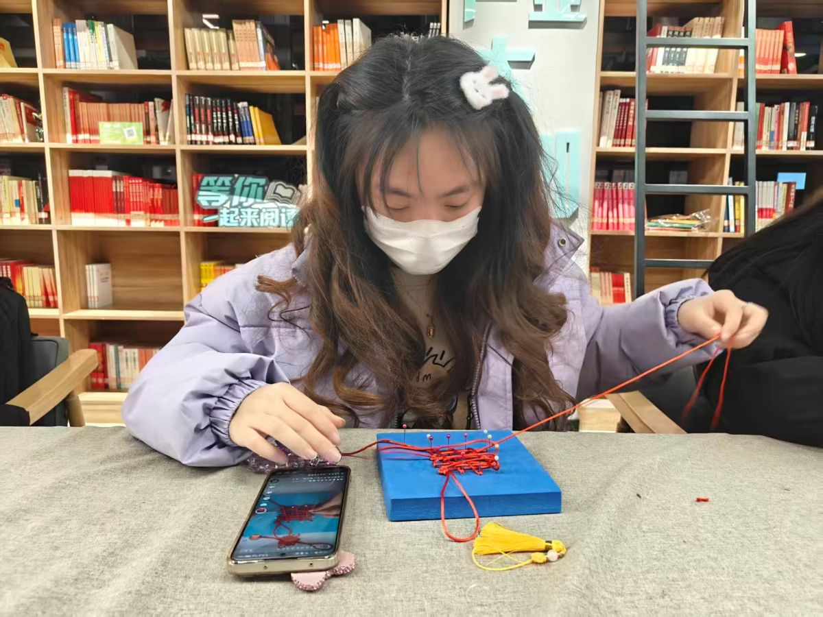 中国结承载团圆、美满、平安的吉祥寓意,是东方美学与传统智慧的缩影。活动伊始,组织者讲解中国结历史渊源与文化内涵,结合线上教学视频拆解彩绳选择、基础打结、造型组合等技巧,解答绕线松散、结型不规整等难点问题。实操环节中,同学们手持彩绳、剪刀等工具,裁剪丝线后专注进行穿、绕、扣、编、系操作,遇卡顿便回看视频或相互请教,在互帮互助中完成平结、双联结、吉祥结等作品。