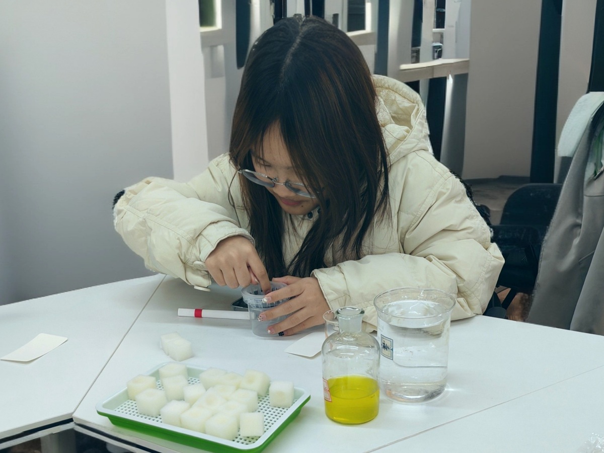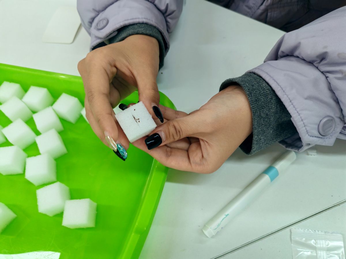 随后同学们将草莓种子小心翼翼嵌入海绵基质中,通过定期补充清水、调控光照的方式开展无土培育。海绵的多孔结构既能牢牢固定种子、锁住水分,又能保证根系呼吸顺畅,短短数日便有嫩绿芽苗破土而出。不仅锻炼了动手能力,更解锁了“低成本+易操作”的绿植培育新方式,用创意为校园生活增添了一抹自然生机。