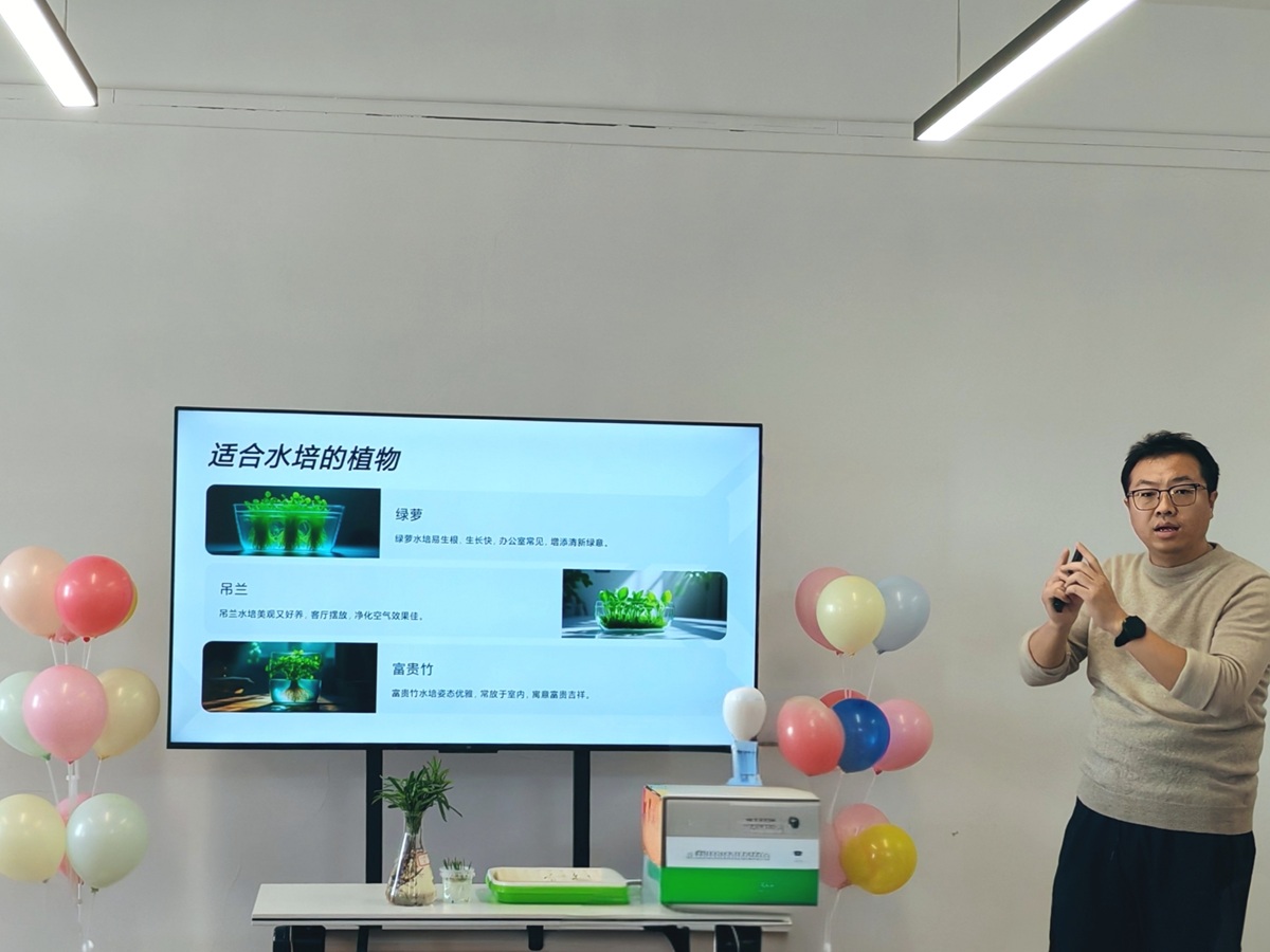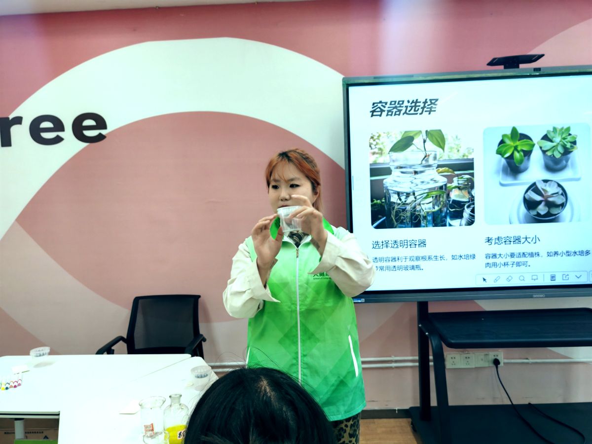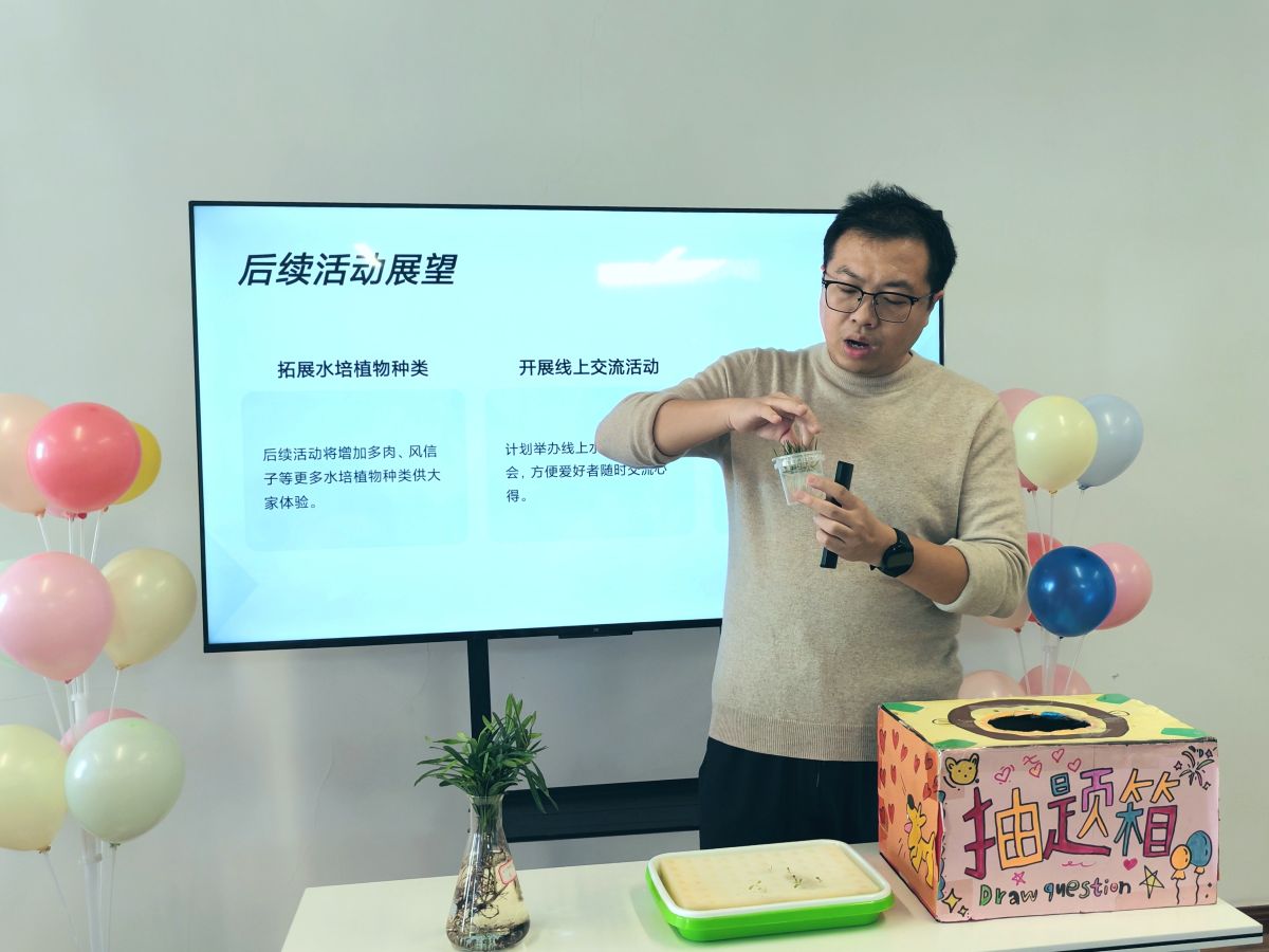“水培不仅是一种种植方式,更是一场与生命对话的艺术。无需土壤,仅凭清水与营养液,种子就能生根发芽、茁壮成长,这正是生命坚韧与神奇的最好证明。”主持人以“一杯水的生命奇迹”为主题,用生动的语言讲解了水培的艺术价值与科学原理,打破了大家对水培的陌生感,让每个人都跃跃欲试。