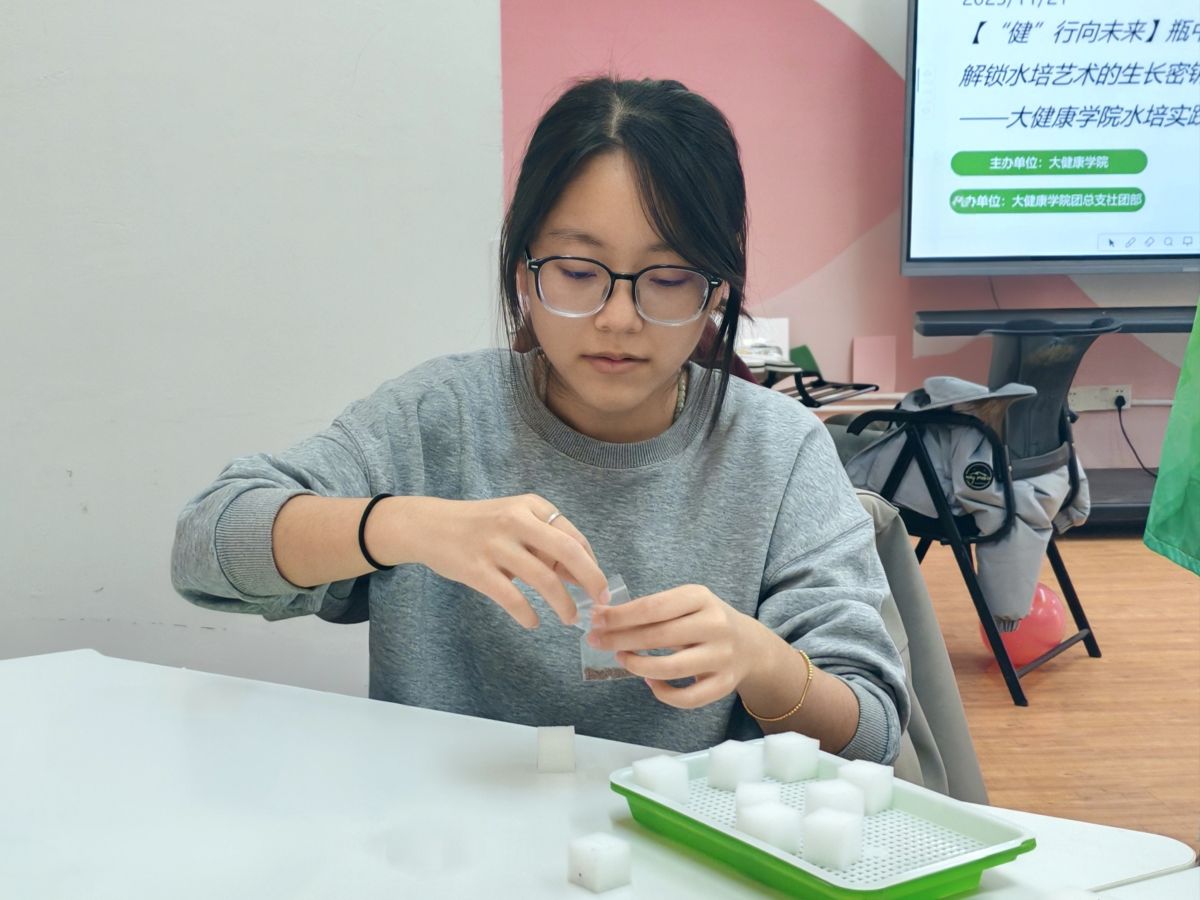 同学们随机领取水培植物种子与培养皿,忍不住分享起自己与植物的难忘故事。“小时候养过一盆多肉,看着它从小小的嫩芽长成饱满的植株,那种成就感至今难忘”“去年尝试过土培,但总养不好,希望这次水培能收获不一样的惊喜”,真挚的分享让现场氛围迅速升温,也让大家对水培之旅充满期待。