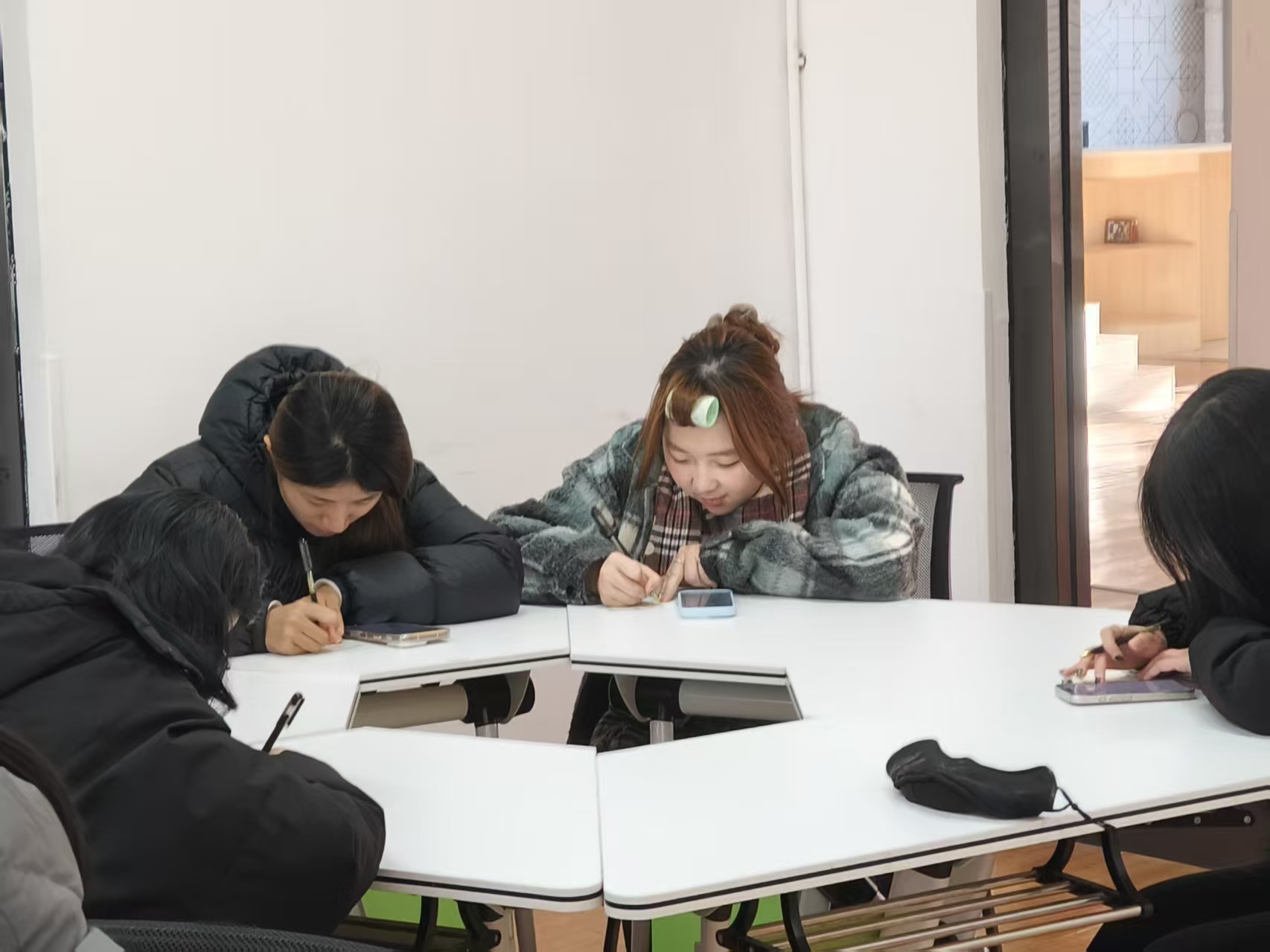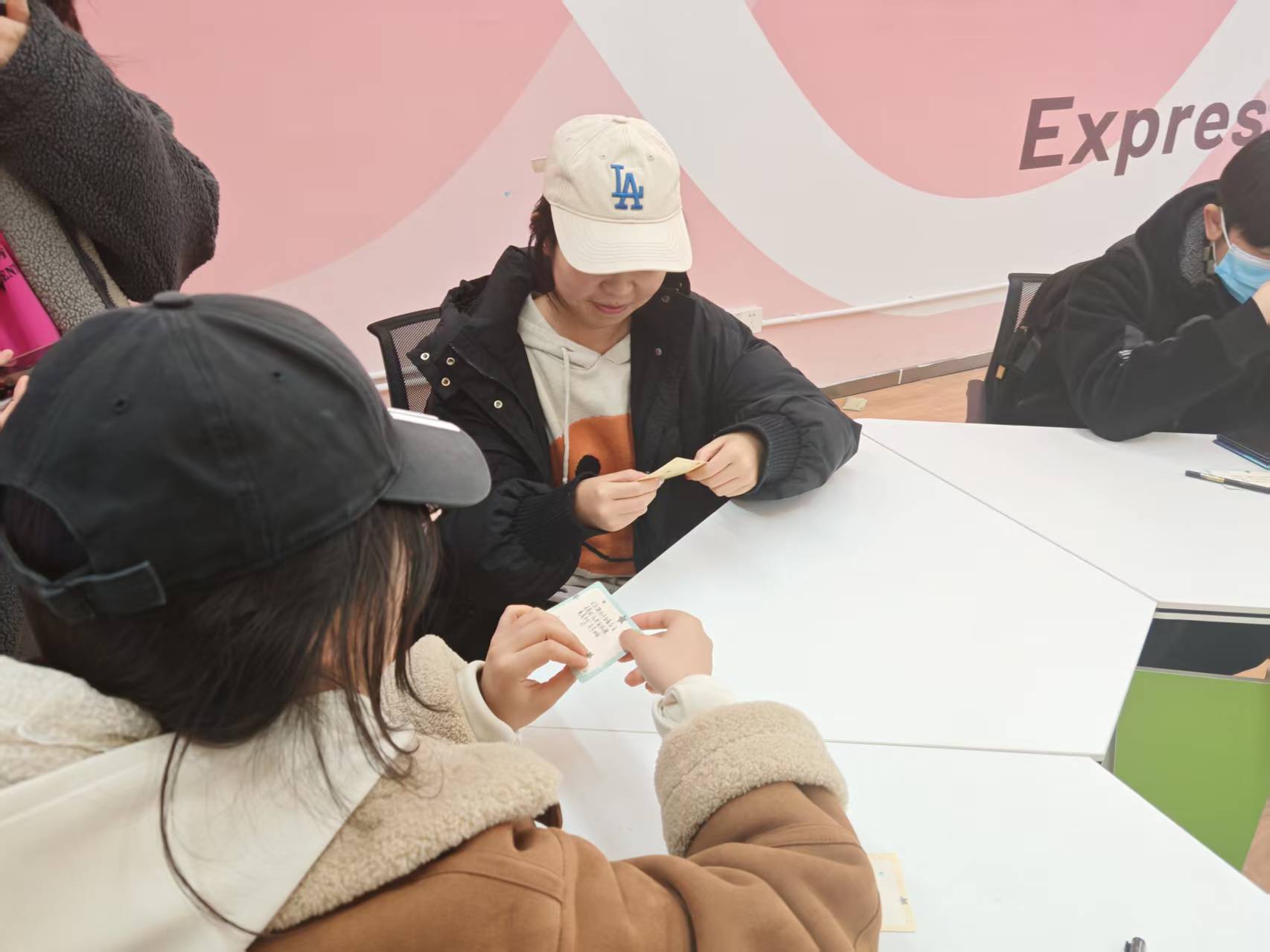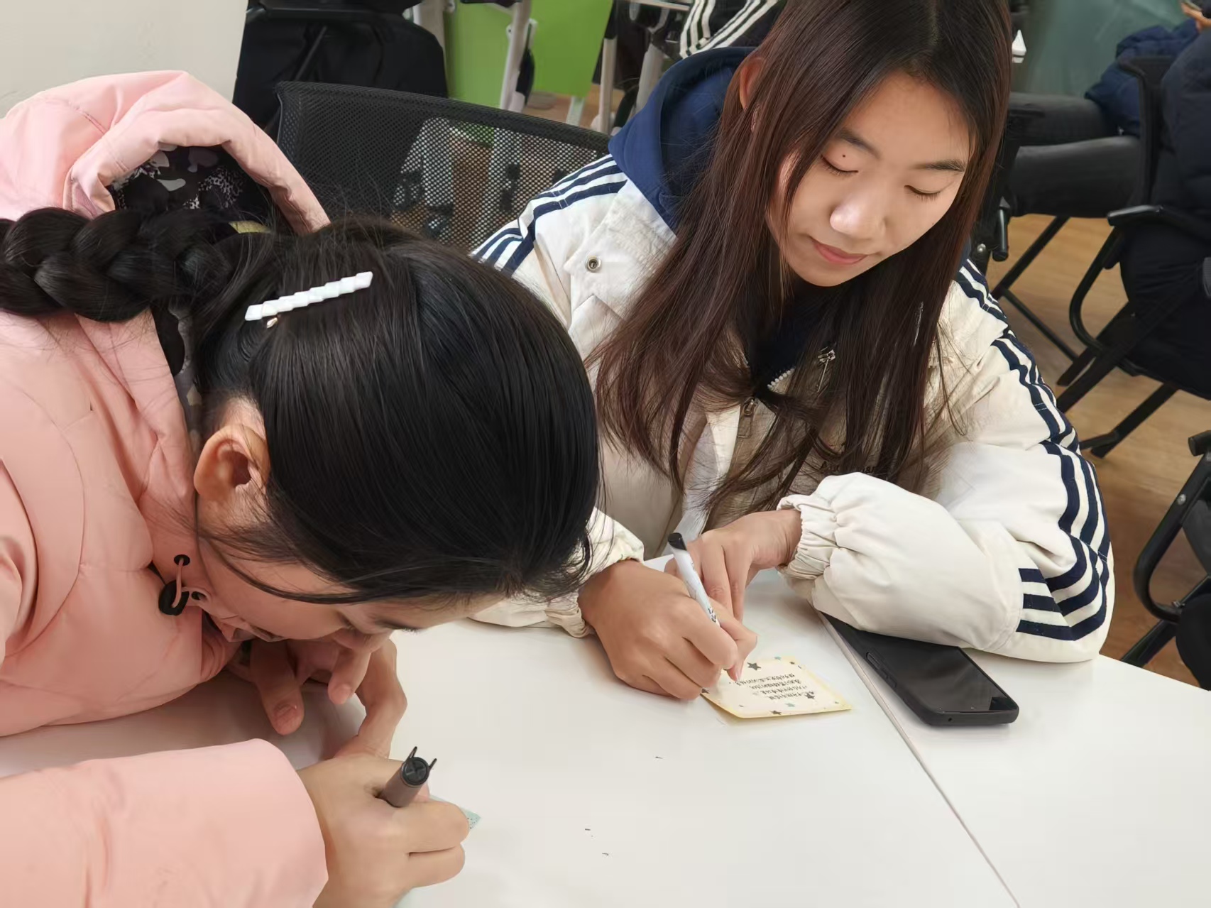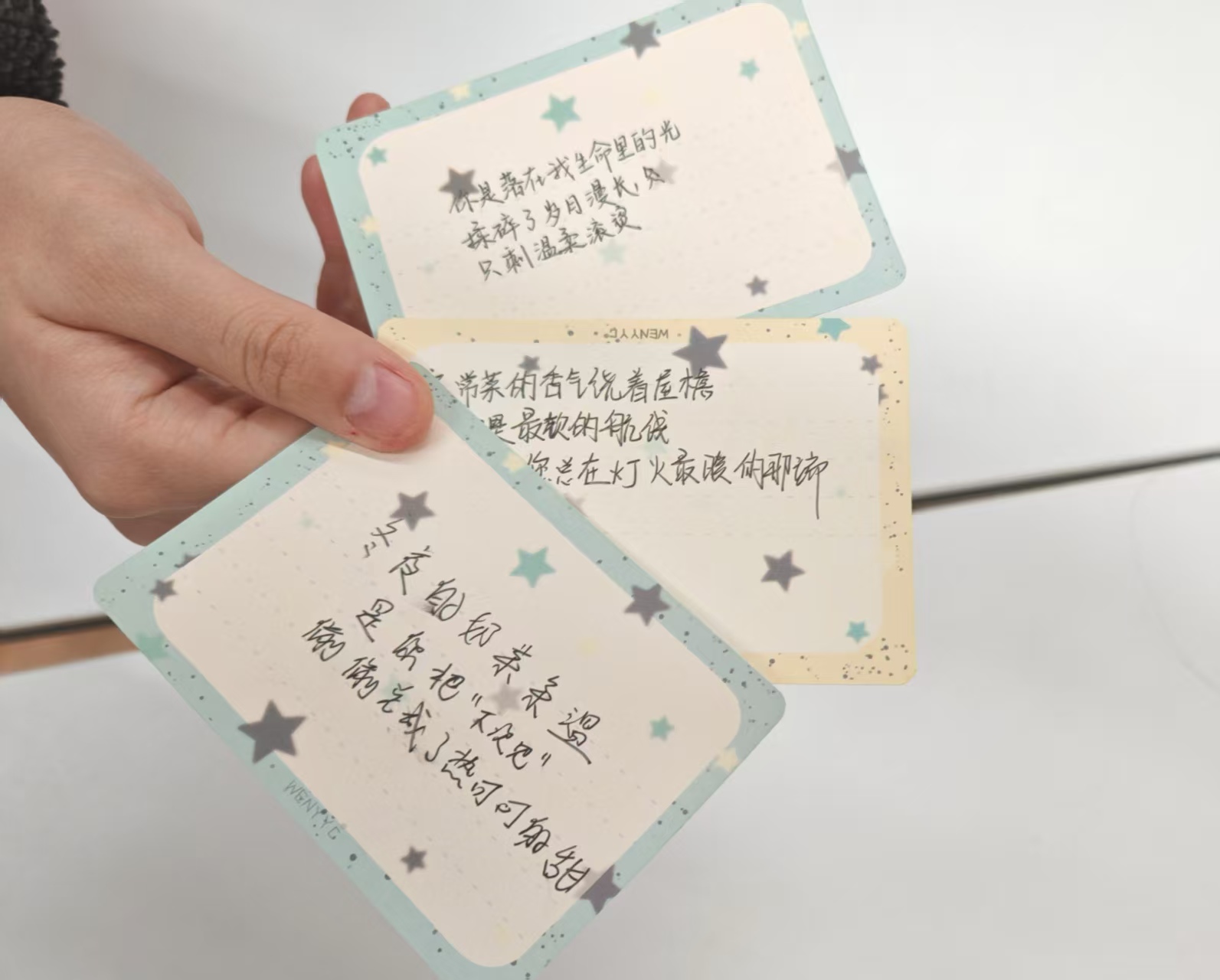 “冬笺三行,字裹温暖”,是这场活动最生动的注脚。活动开始,组织者闫佳艺以“文字联结与情绪表达”为核心开启分享环节。通过对鲜活的三行情书案例进行细致拆解,辅以“如何用短句承载温柔”的创作技巧讲解,清晰阐释了极简文字对于情感传递的正向作用,还贴心分享了“意象+短句”的实操创作方法,瞬间点燃了全场同学们的参与热情。大家专注记录“温柔创作公式”,从“如何捕捉冬日细节”到“如何用文字承载心意”,互动间迅速拉近了与创作的距离,为后续书写铺垫了温暖基调。