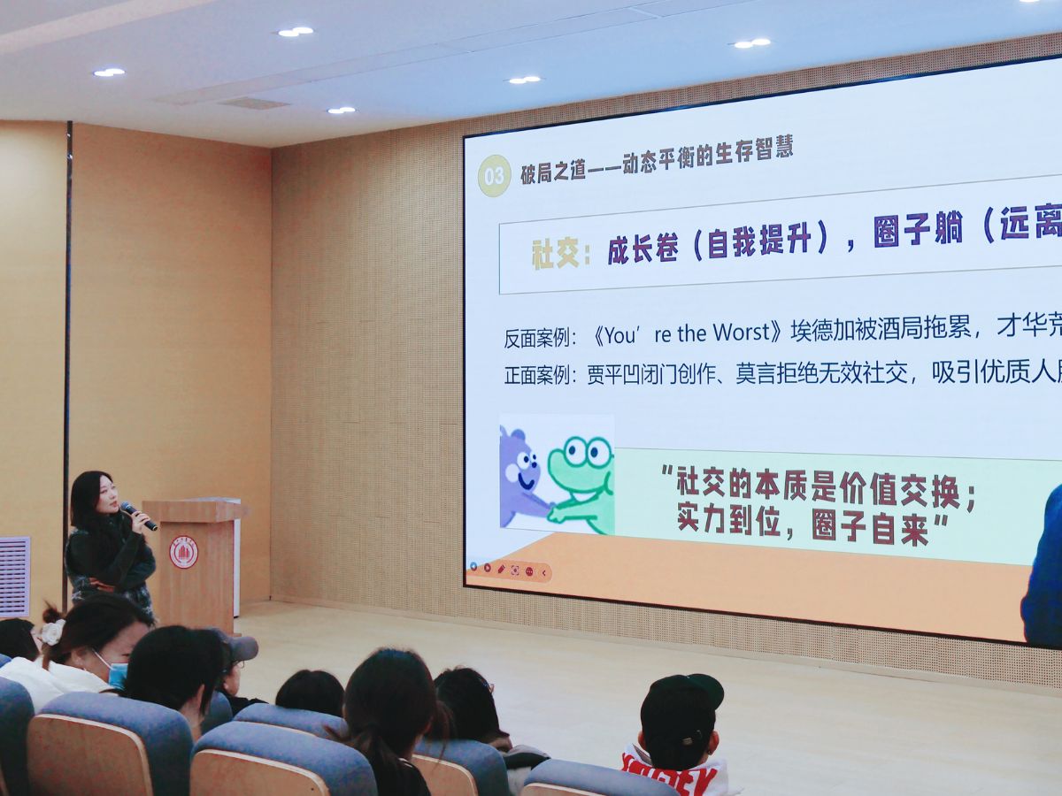 为破解困境,常佳老师设置小组讨论环节,围绕“竞赛失败后消极避世”“盲目考研效率低下”“高强度备考后彻底躺平”三个校园情景,让学子分析成因并给出平衡建议。在热烈讨论后,常佳老师抛出了核心解决方案——“动态平衡”理念,以孔子“积极入世”与庄子“超然物外”的智慧作喻,指出“卷是上进姿态,躺是通透智慧,真正的成长的是在二者间找到平衡”。