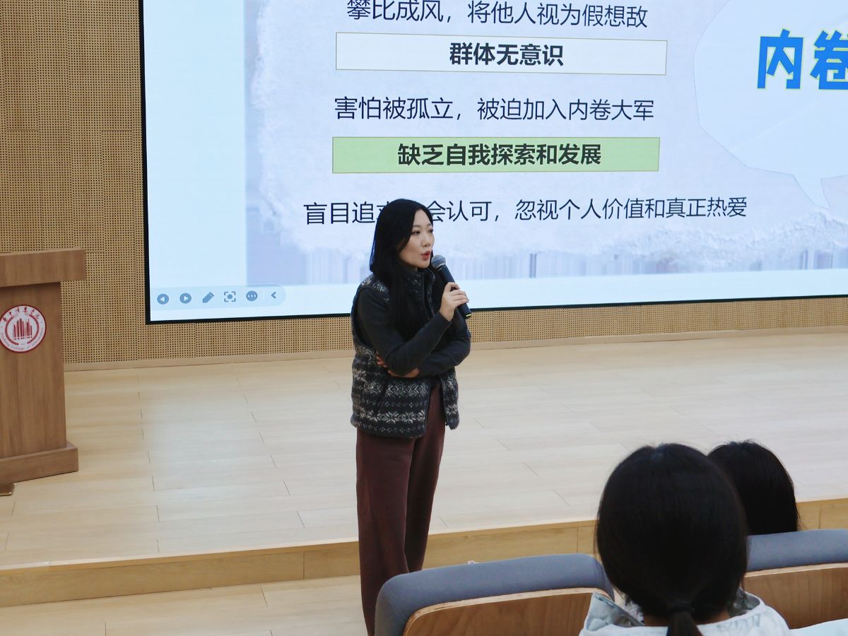 AI的浪潮席卷而来,当‘内卷’的硝烟弥漫校园,当‘躺平’的声音悄然蔓延,当代青年究竟该以怎样的姿态直面人生选择?”12月5日,一场聚焦“AI时代青年成长困境”的主题分享ST报告厅举行,围绕“躺平”与“内卷”这一当下最受关注的青年话题,大健康学院2025级辅导员常佳老师以细腻的观察、深刻的剖析,带领在场学子拨开时代迷雾,探寻AI浪潮下的成长答案。