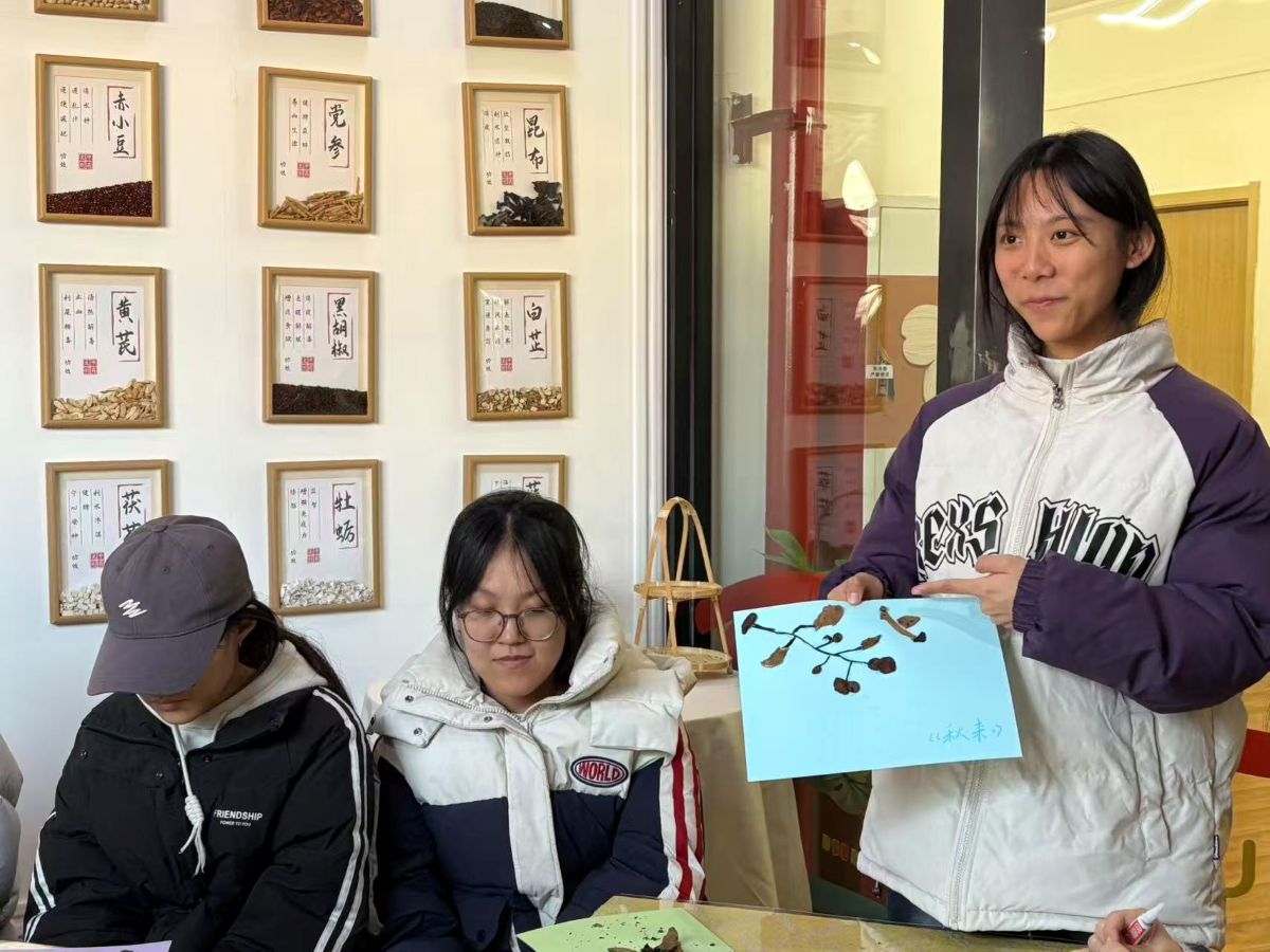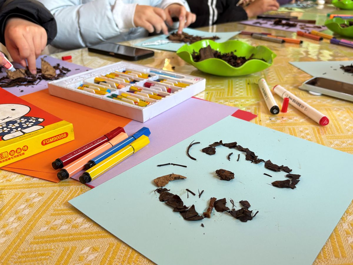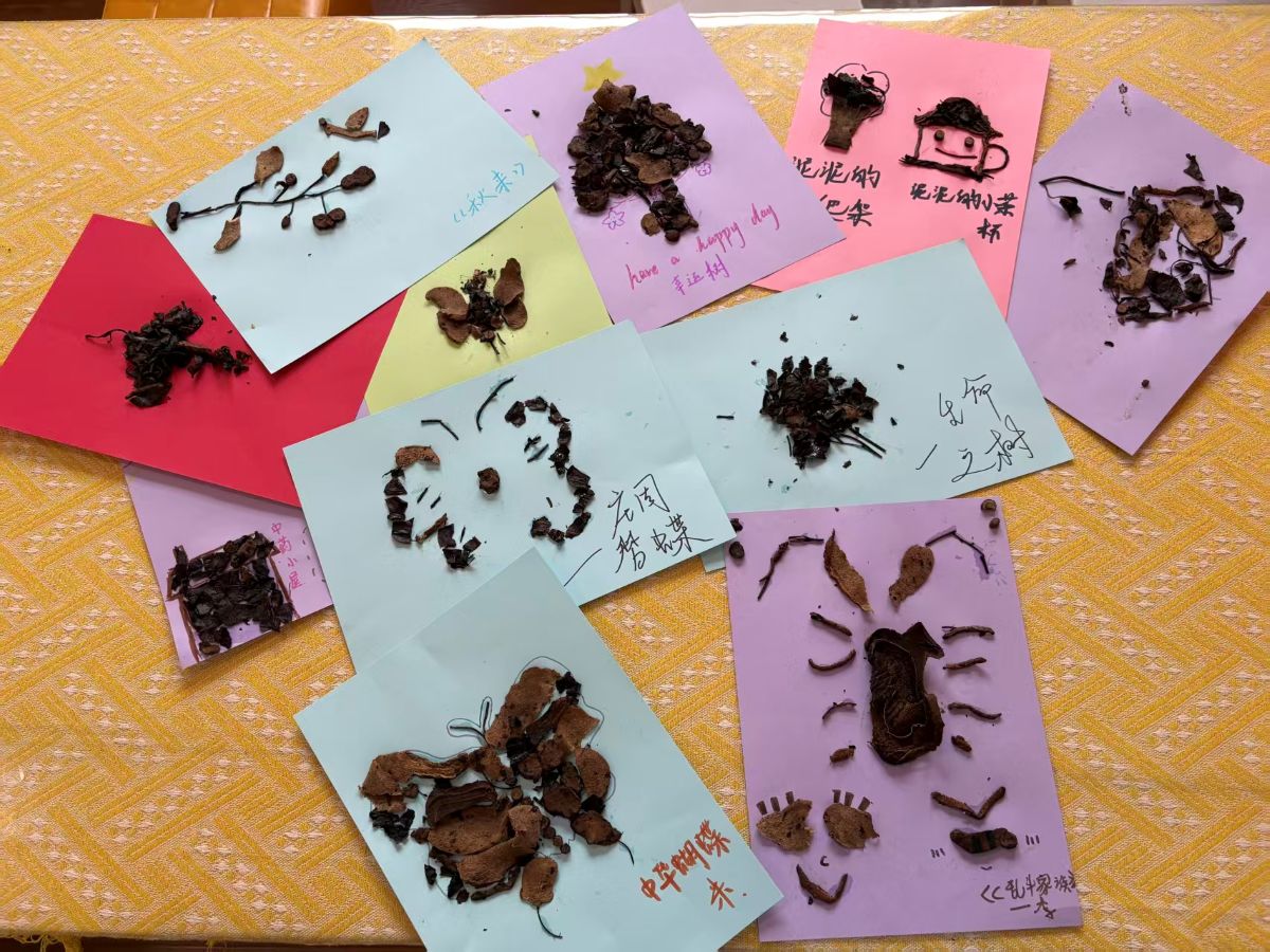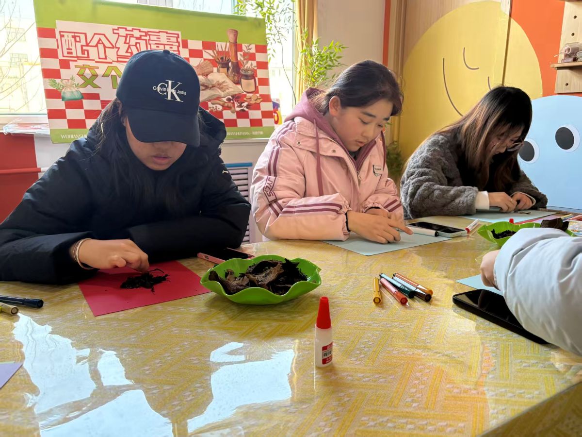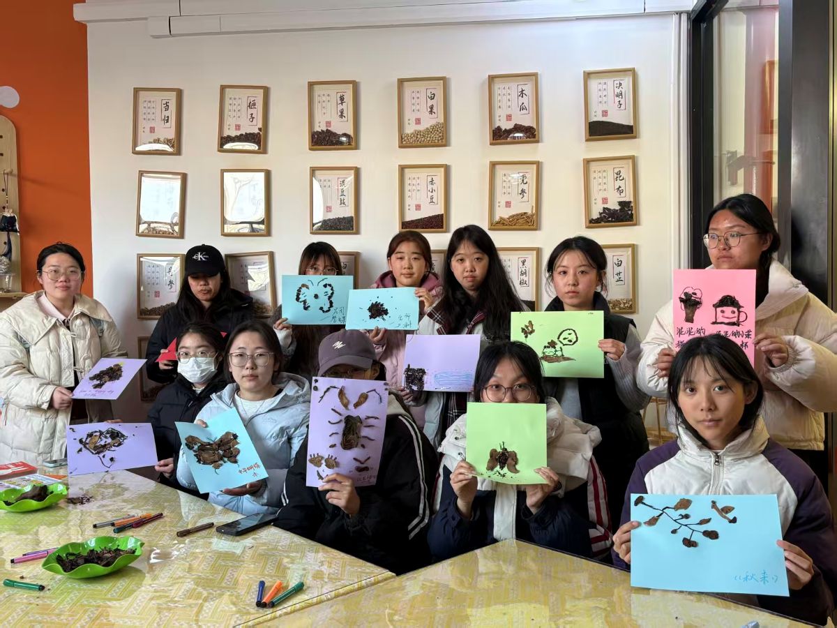 在充满巧思的创作现场,经处理的湿润中药渣褪去药香,化身天然“彩泥”。当归的绛红、陈皮的暖黄、甘草的浅褐,带着草木独有的纹理与温润触感,在参与者指尖流转。大家或勾勒抽象纹路,或描摹山水草木,或书写暖心标语,在卡纸与画布上,原本的本草弃料仿佛被赋予生命,在指尖跳跃、绽放。