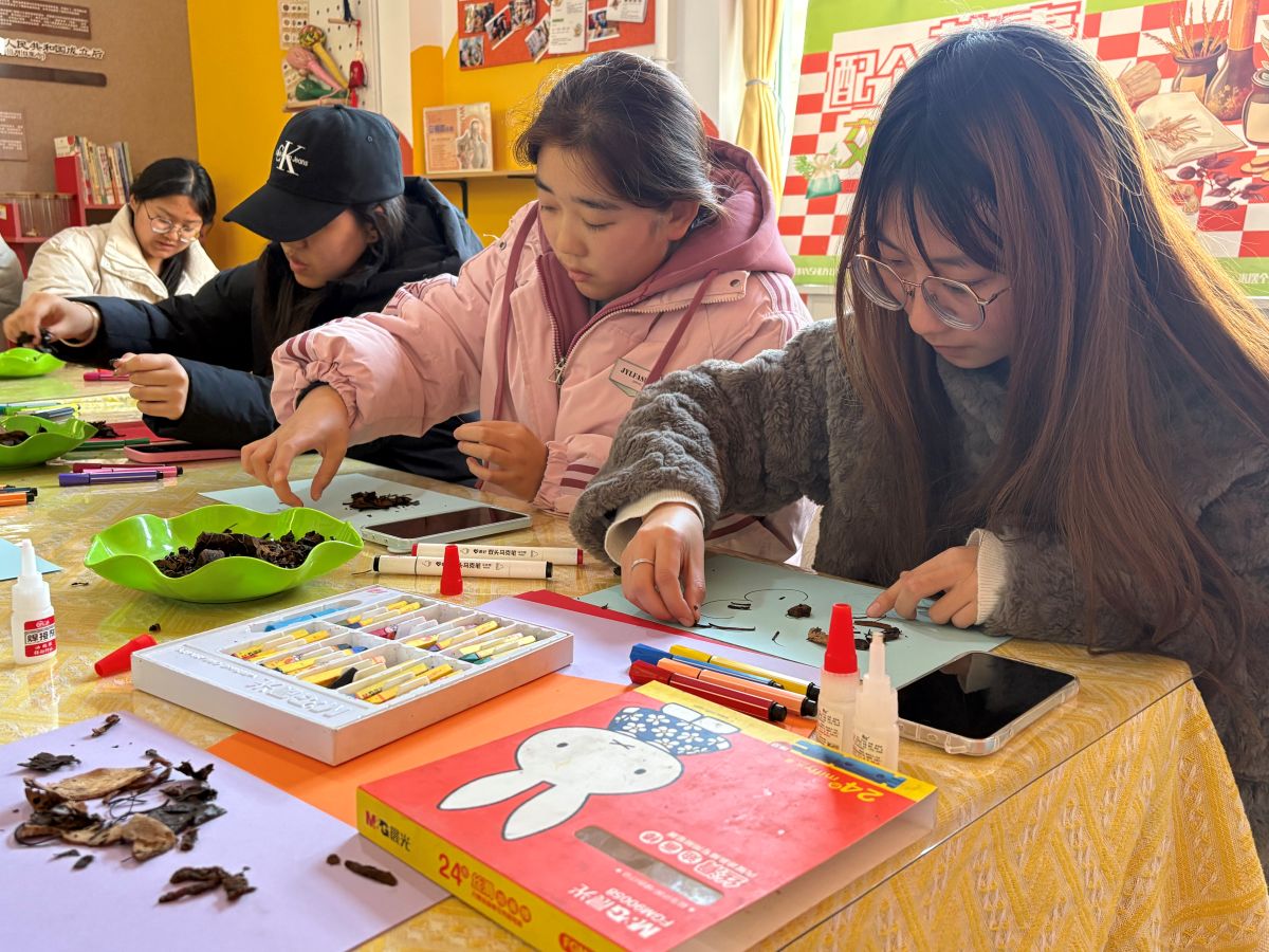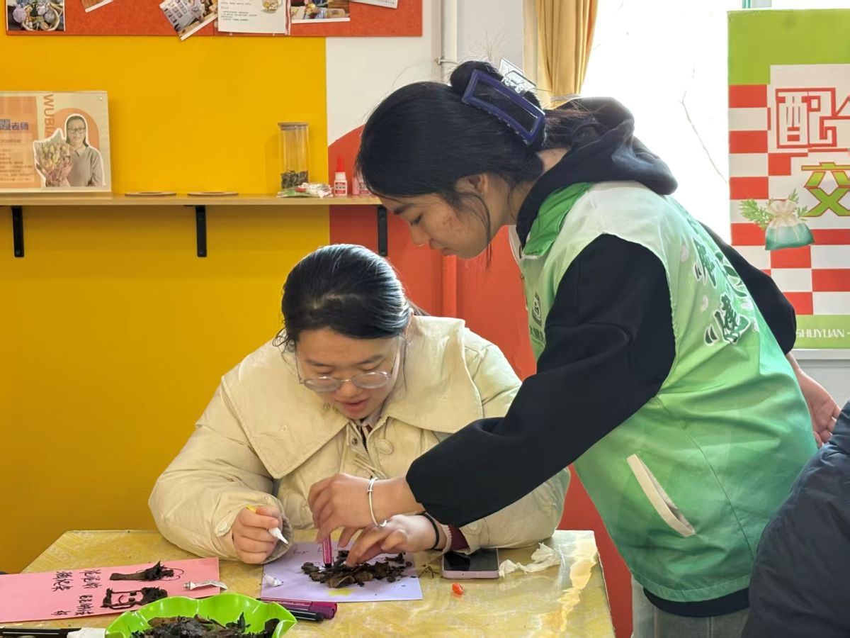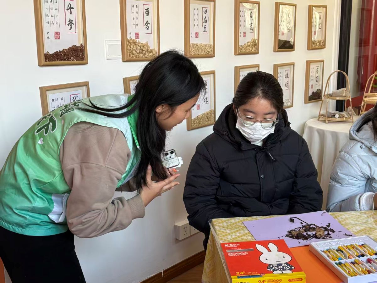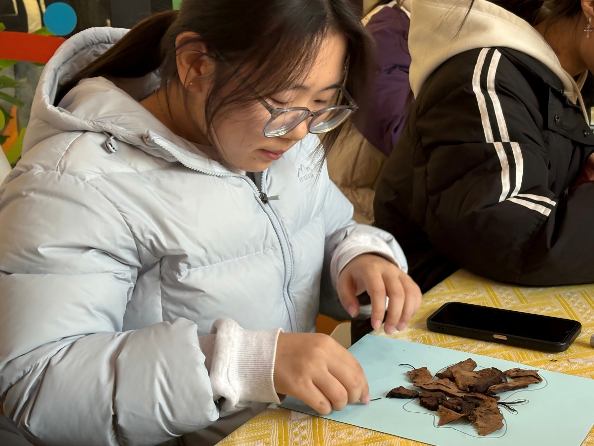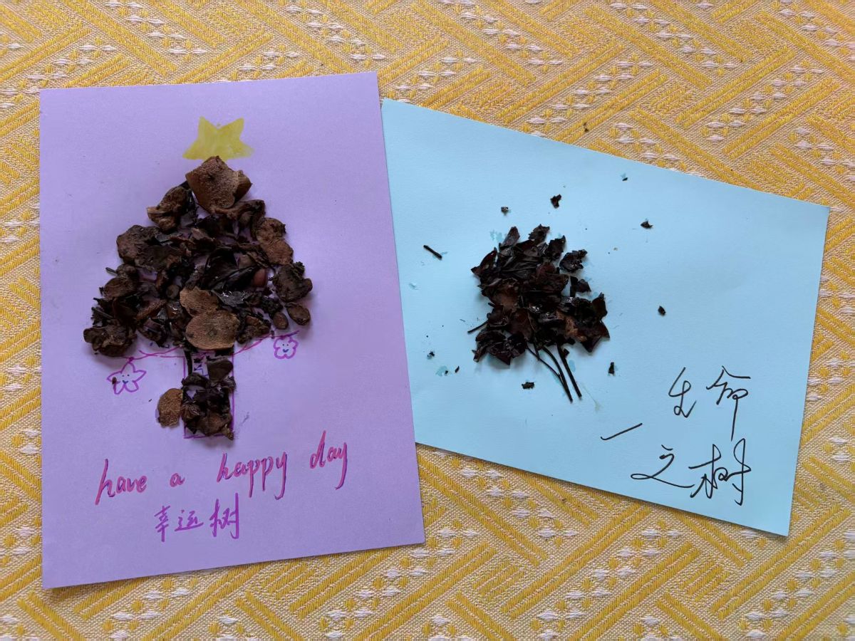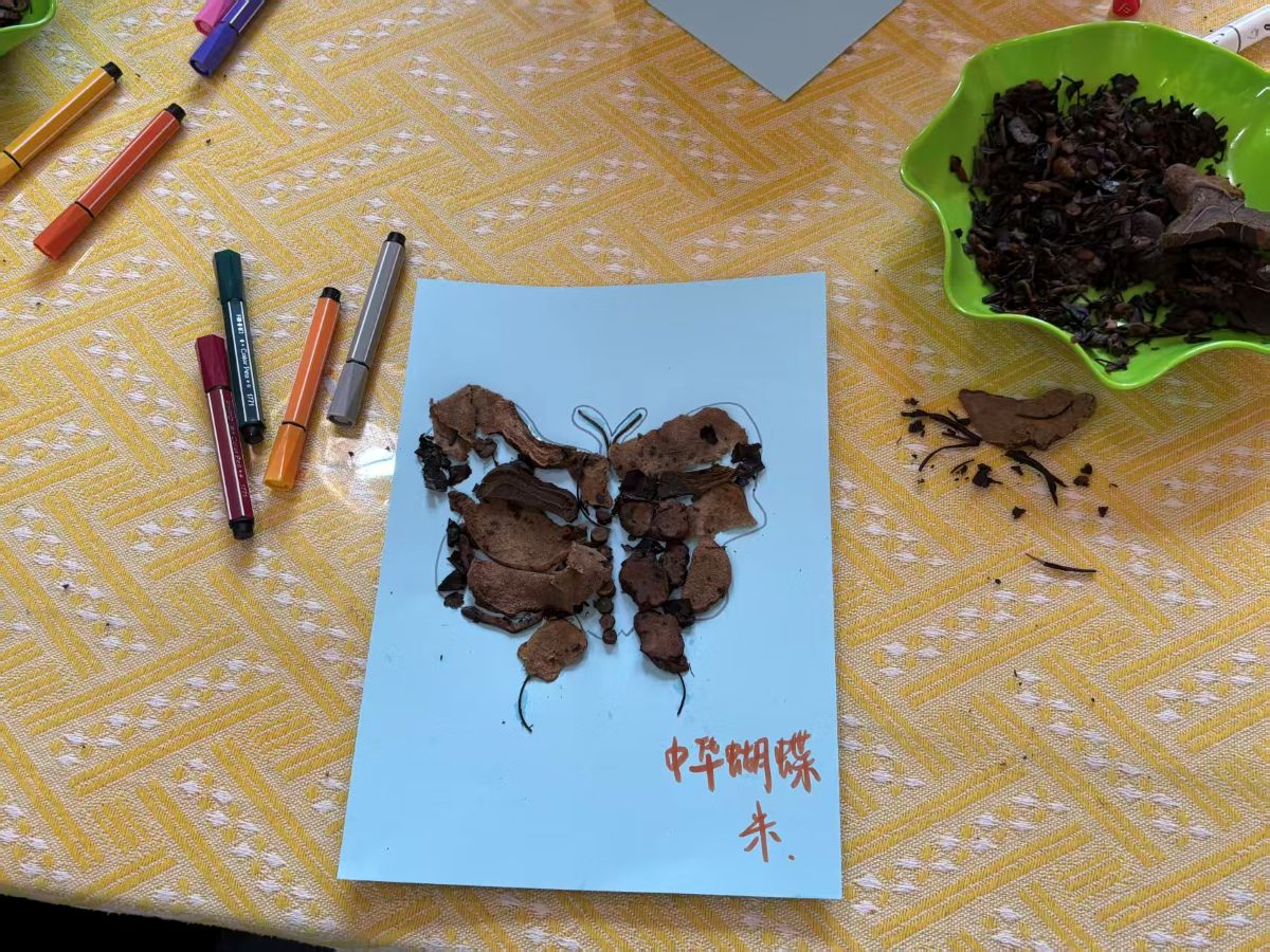 在充满巧思的创作现场,经处理的湿润中药渣褪去药香,化身天然“彩泥”。当归的绛红、陈皮的暖黄、甘草的浅褐,带着草木独有的纹理与温润触感,在参与者指尖流转。大家或勾勒抽象纹路,或描摹山水草木,或书写暖心标语,在卡纸与画布上,原本的本草弃料仿佛被赋予生命,在指尖跳跃、绽放。