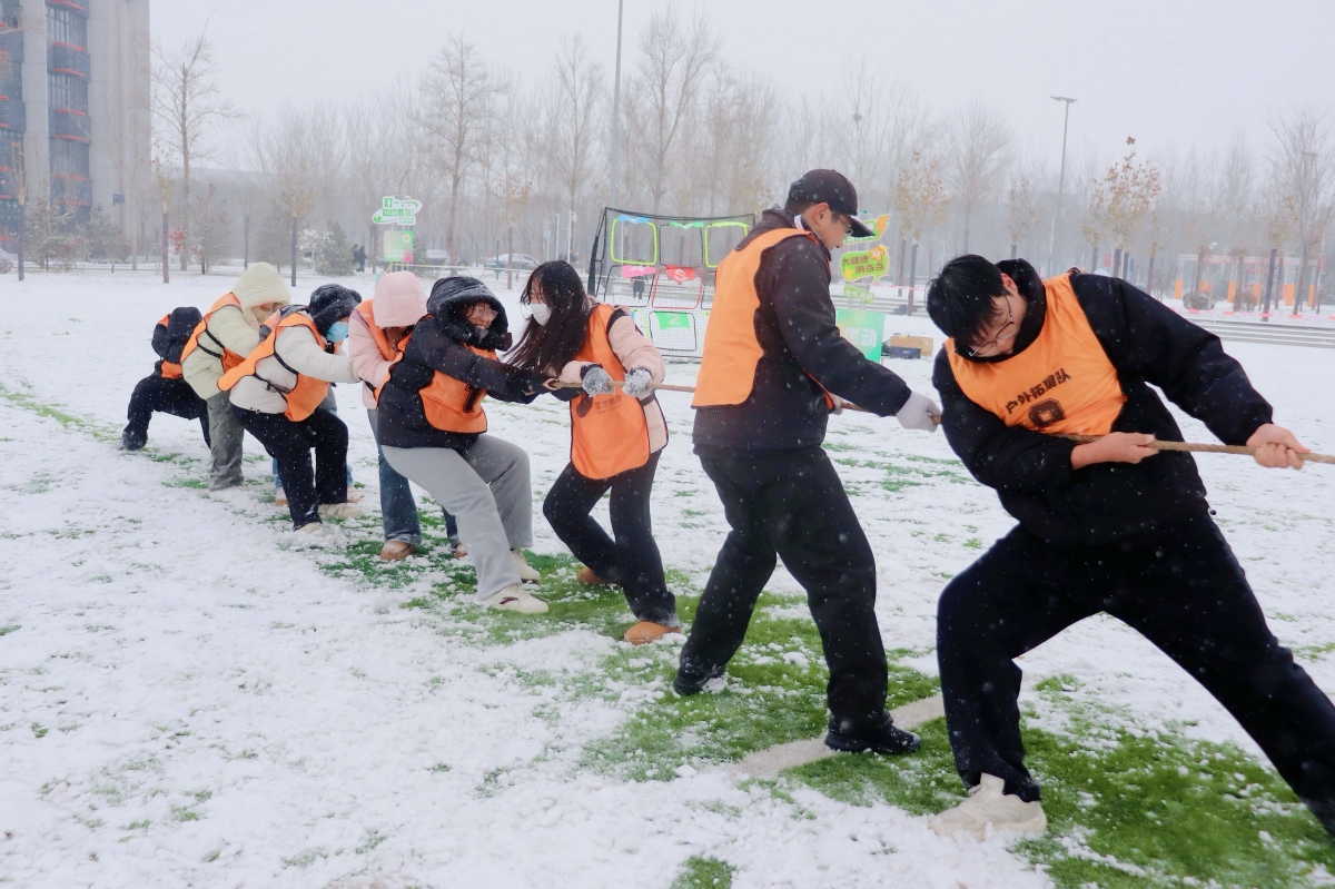 白雪覆盖的赛场被划分成多个趣味区域,处处是热火朝天的景象。靶位闯关区里,队员们相互支招、精准瞄准,雪球撞击靶心的清脆声响与欢呼声此起彼伏;雪弹大作战环节中,白色雪团在空中划出弧线,大家躲闪奔跑、默契配合,雪地上留下一串串深浅不一的脚印与爽朗笑声;核心的拔河对决现场,参赛队员们脚蹬积雪、身体后倾,紧握麻绳的双手因用力而指节泛红,麻绳在冰雪中被拉得笔直,双方你来我往间,雪沫随着动作飞溅,队员们的呐喊声震彻赛场,盖过了寒风的呼啸。