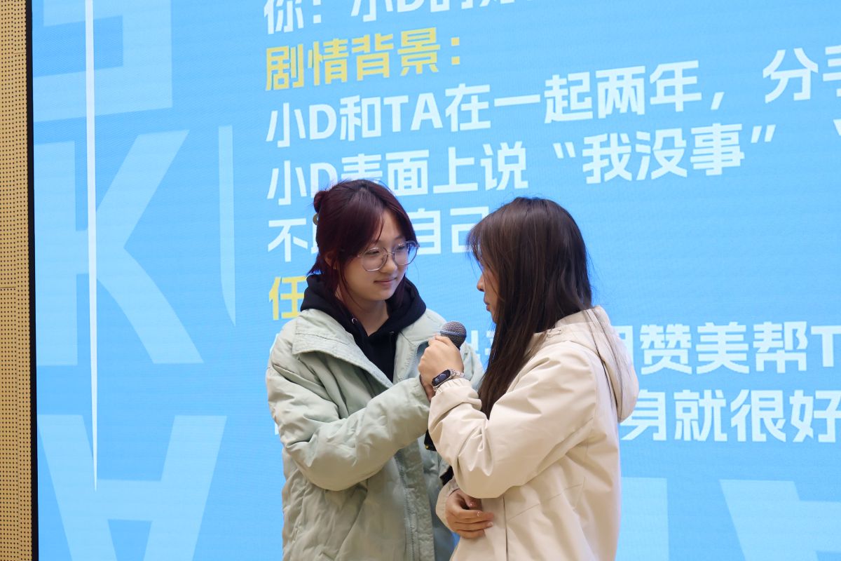趣味十足的互动环节正式开启,同学们热情高涨、积极参与。“夸夸大王”环节中,手持手举牌的“大王”随机选择同学,被选中者用真诚的赞美打动“大王”,欢声笑语中,大家渐渐克服赞美表达的羞涩;“做自己的王”环节,在常佳老师的引导下,同学们勇敢直面自我,大声说出自己的两个优点或近期值得骄傲的事,在自我肯定中提升自信心;“夸夸剧本杀”环节则极具挑战性,各组抽取难夸场景剧本,通过讨论与情景表演,将所学赞美技巧运用到实际生活场景中,学会用温暖的话语打开他人心结,传递正向能量。考研失利的情景里,同学们用赞美肯定对方的努力与坚持;分手的情景中,大家聚焦朋友的自身价值,帮其找回自信;面对内向学霸,大家则挖掘其思维与能力的闪光点,鼓励其勇敢表达。