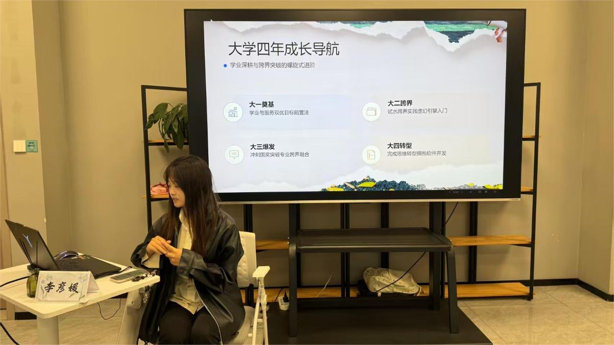 金秋时节,又一批新生怀揣梦想踏入大学校园。面对全新的学习环境与未来规划,如何在学业深耕与能力拓展之间找到平衡点,成为许多学子关注的焦点。9月23日下午,一场别开生面的线下成长分享会如期举行,艺术传媒学院环境设计2201班的李彦媛同学以“智育领跑·跨界破界”为主题,深情讲述了她从专业学习到竞赛突破、从艺术设计到软件开发的精彩蜕变历程,为学子们呈现了一条独具特色的大学成长路径。