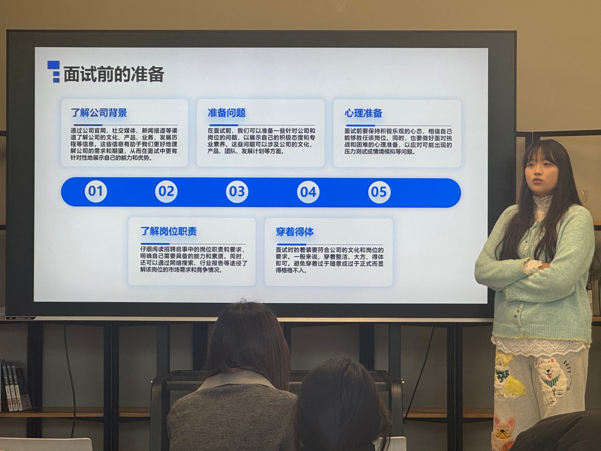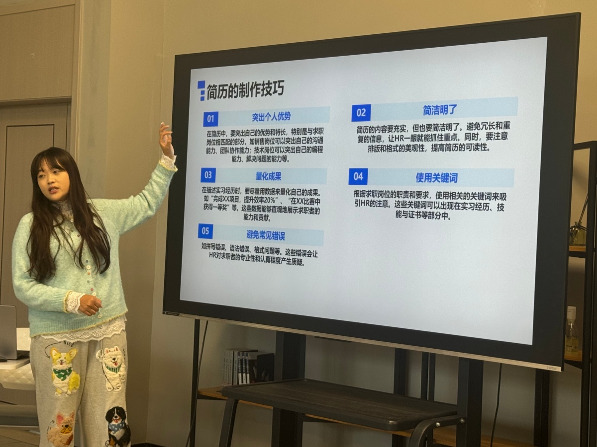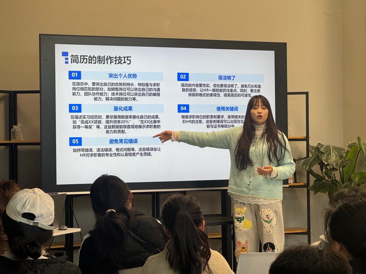 在最后的赋能环节,刘悦老师鼓励同学们立足当下,从提前规划、完善简历、提升专业素养、加强模拟面试、拓展人脉资源以及保持积极心态等多个维度积极准备。她寄语在场学子,要以青春的自信与坚韧,迎接求职路上的每一次挑战,将所学所练转化为开启职业之门的钥匙。