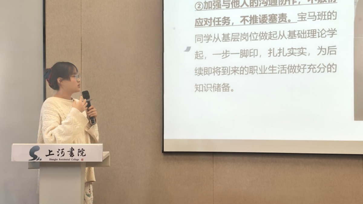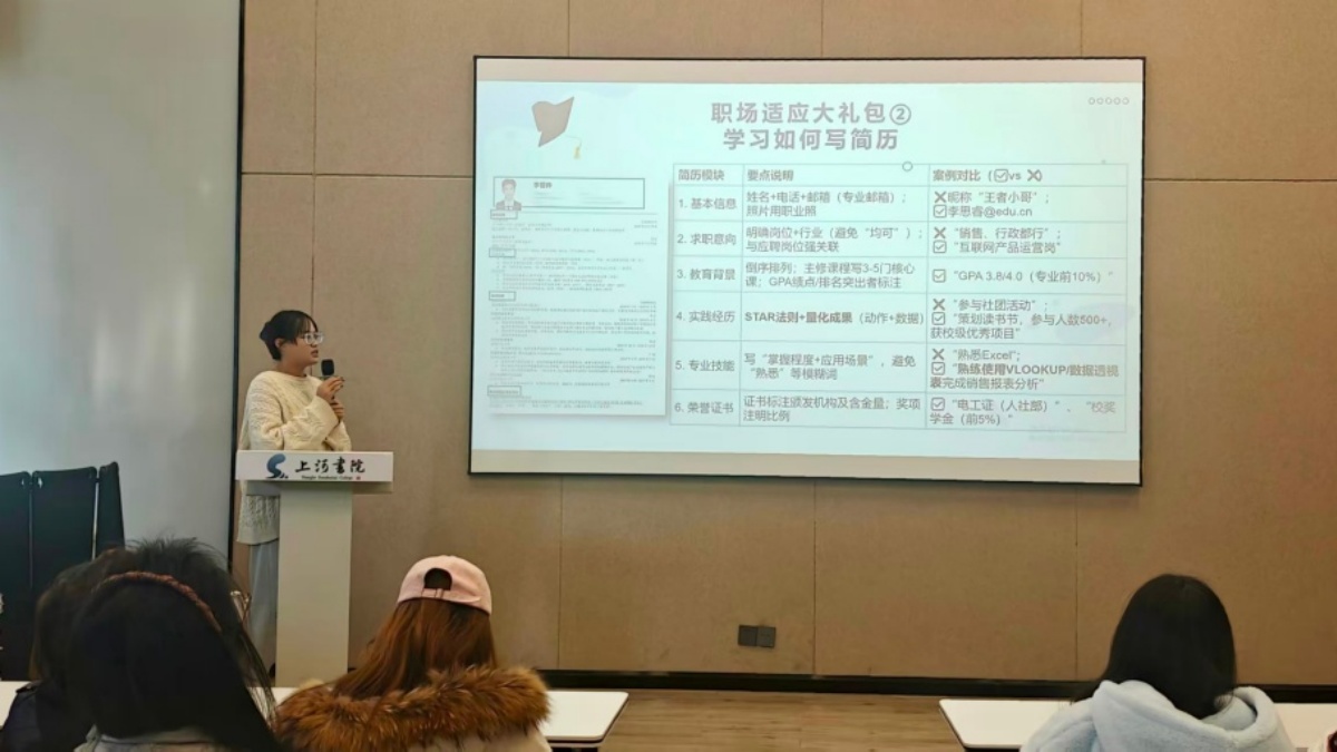 在“职业适应早准备”环节,刘悦老师以“宝马班”同学的实践经验为例,鼓励同学们珍惜在校时间,积极参与实习实训,强化专业技能与沟通协作能力。她还为同学们准备了“职场适应大礼包”,涵盖简历撰写技巧、常见招聘平台介绍以及模拟面试训练等内容,助力同学们提升求职竞争力。