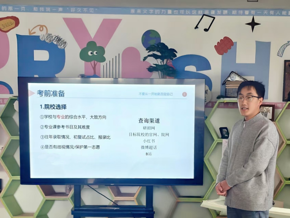 校友闫震的分享逻辑清晰、体系完备,从备考全流程为学弟学妹们搭建起系统的备考框架。他开篇即聚焦“考前准备”这一核心起点,细致拆解了院校与专业选择的科学方法论,着重强调选择需立足自身实力,综合权衡院校层次、专业竞争力、历年报录比、真题获取难度及备考资源适配度等关键因素,避免盲目跟风择校。