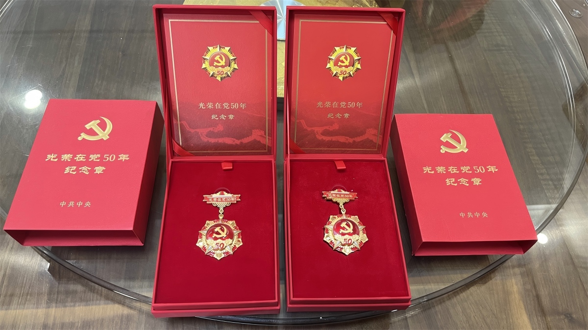 在交流过程中,石爷爷和石奶奶还拿出了自己50年党龄纪念徽章,桌子上摆放的国旗党旗小摆件、佩戴过的党员徽章等。每一件物品背后都有着一段动人的故事,这些实物见证了老党员为党和人民奋斗的历程,让学生党员们深受触动。