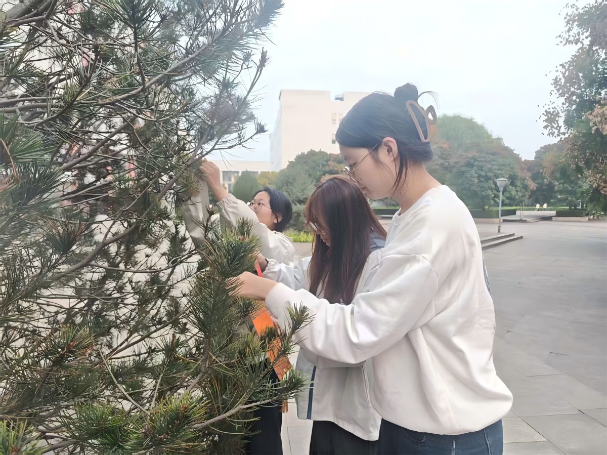 书写完毕,大家手持书签走向树木,轻轻将其挂在枝丫间。红色绳结与绿叶相映,似跳动的星火。这一举动寓意深远:树木扎根生长,象征着党员的爱国初心与奋斗誓言,将如树苗般深深扎根,在祖国发展的沃土中汲取力量,伴随祖国一同向上,让爱国情怀与强国信念,在时光里茁壮成长、永不消散。